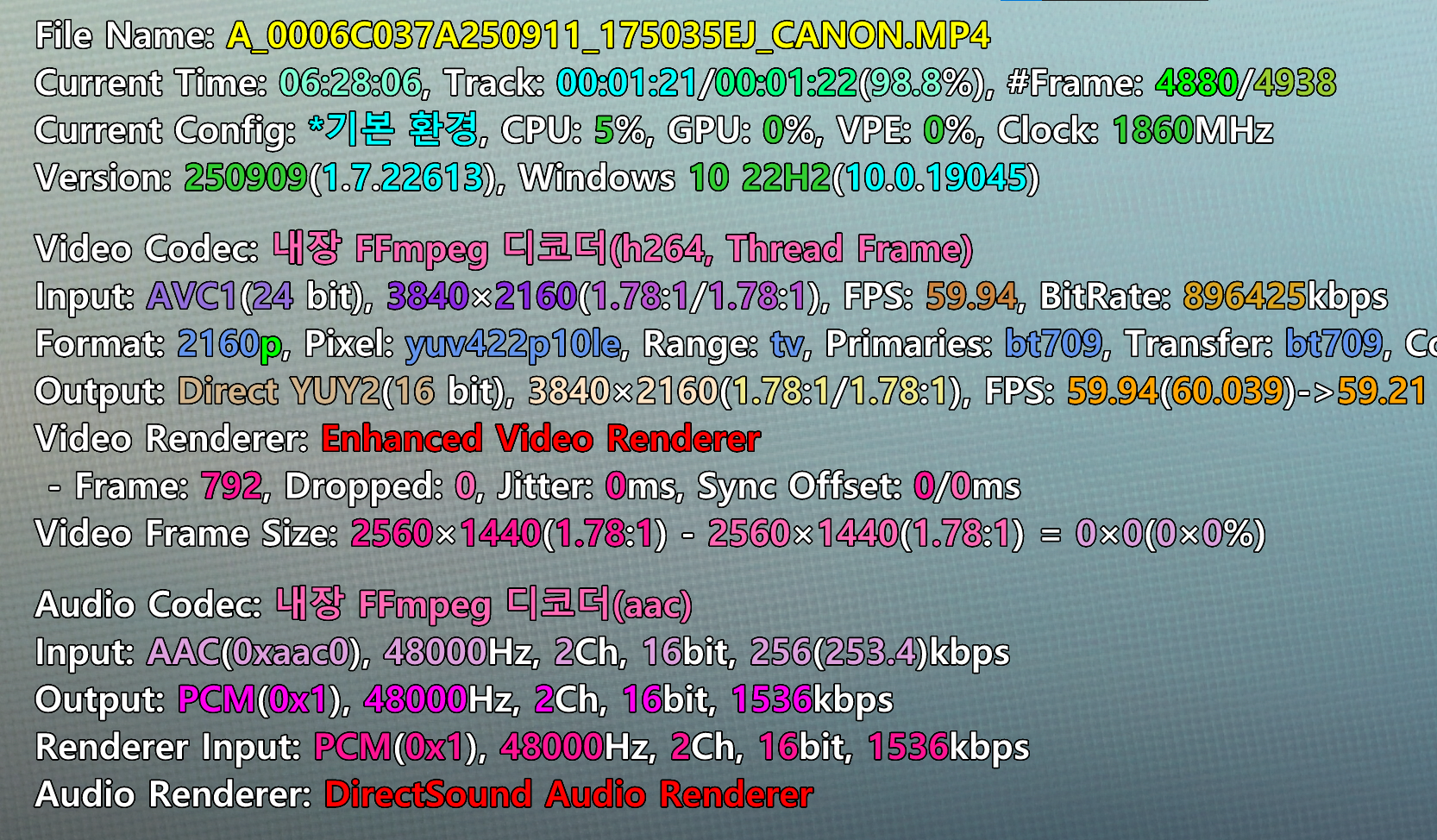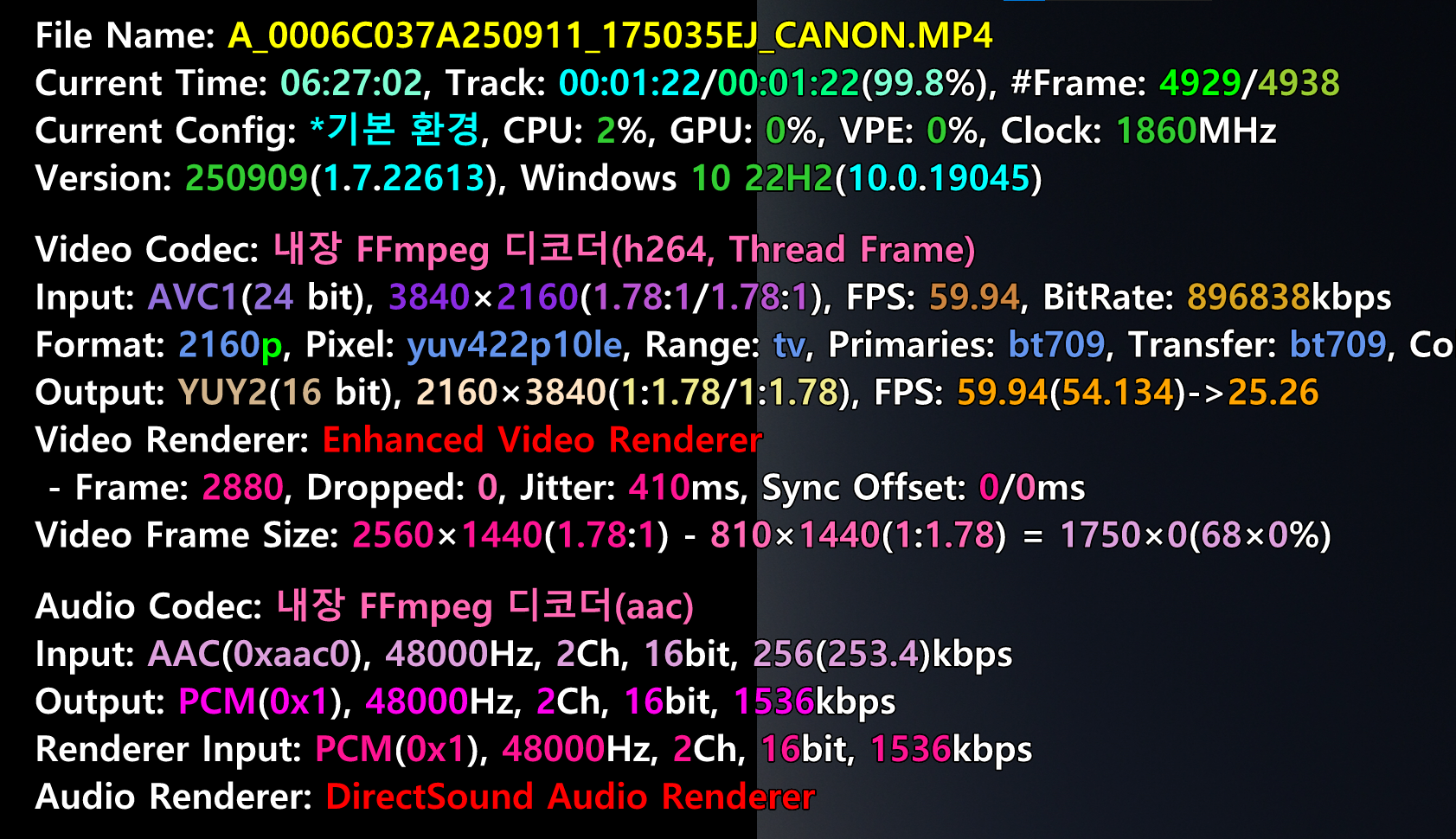 다만 인코딩시 H264 422@10비트 포멧이 아닌 420@8비트로 하면 DXVA가 가능한데, 그럴경우 GPU로 회전 처리가 가능해서 인코딩 옵션을 조절해서 DXVA가 가능한 포맷으로 인코딩을 해보시기 바랍니다. -