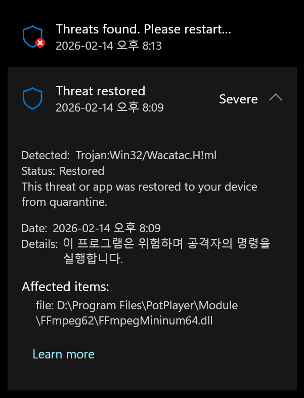 260114 버전 설치 후 트로이목마 작성자야야야|작성시간26.02.14|조회수292 목록 댓글 1 글자크기 작게가 글자크기 크게가 윈도우 포맷하고 최신 버전 설치하니까 이렇게 경고떠요 윈도우 11 25H2 최신버전입니다. 다음검색 현재 게시글 추가 기능 열기 북마크 공유하기 신고 센터로 신고 댓글 댓글 1 댓글쓰기 답글쓰기 댓글 리스트 작성자팟플.개발자 | 작성시간 26.02.17 해당 사항은 백신의 오진 입니다. 댓글 전체보기