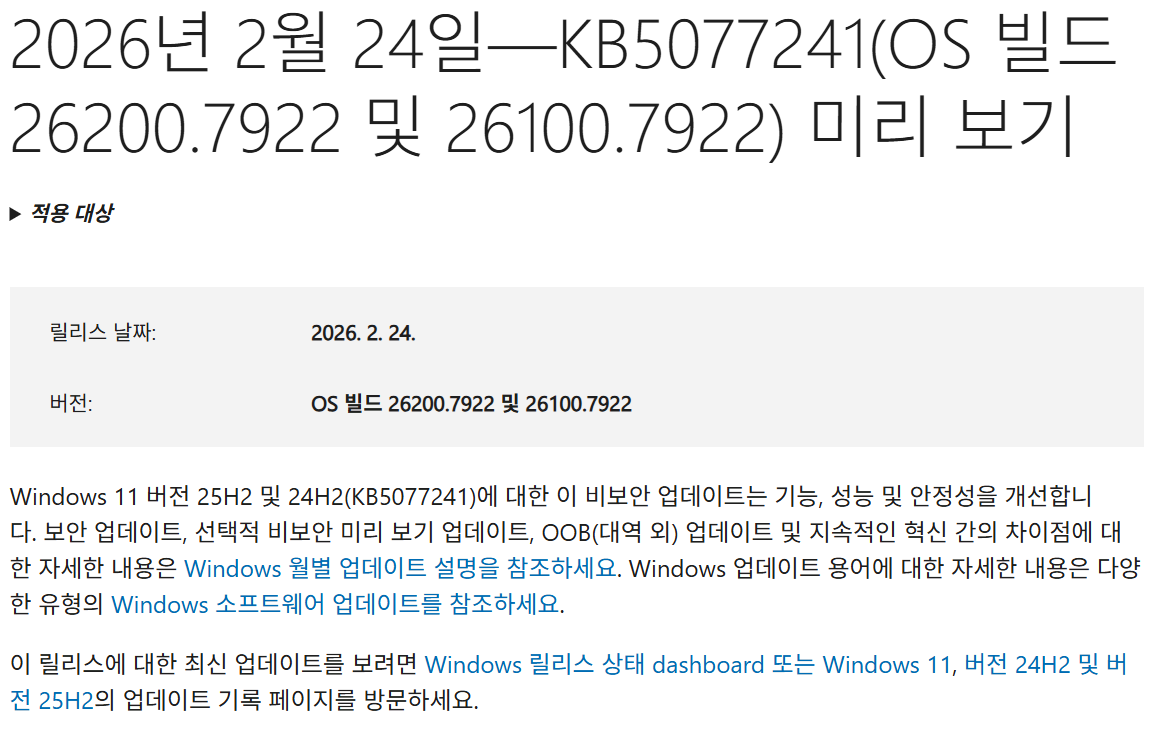 Windows 11 25H2 에서 KB5077241 미리보기 업데이트를 설치하면