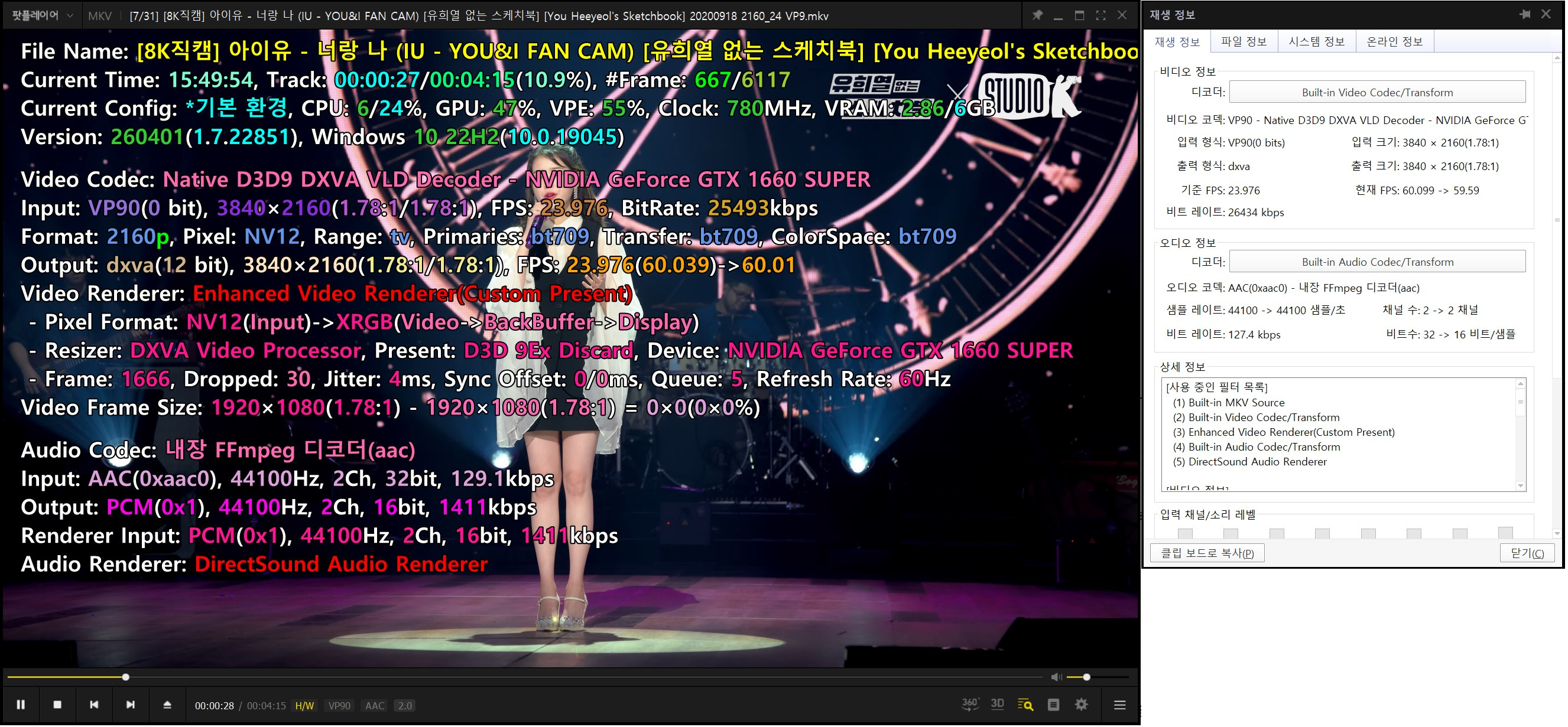 유튜브에서 아이유 8K60 좌절영상을 다운로드하여 재생하는데