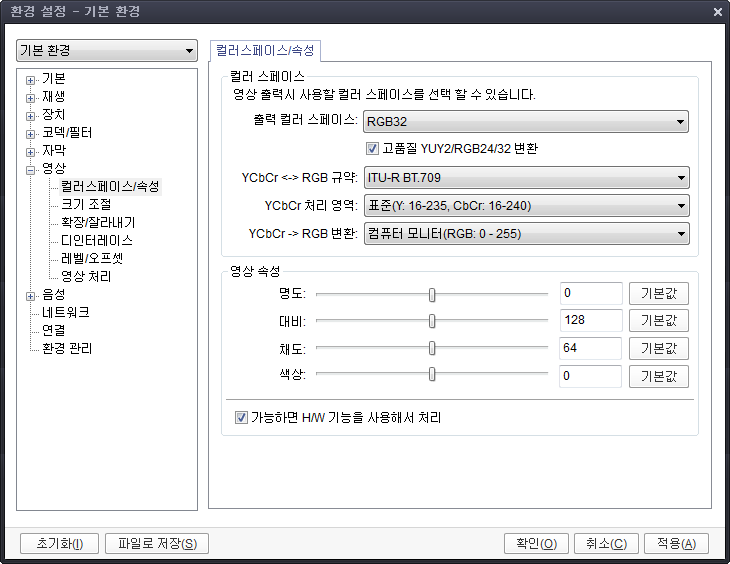 YCbCr처리 영역 옵션같은 경우는 제가 아는바가 없어서 그대로 놔뒀는데 이부분도 RGB변환에 따른 HDTV의 색영역 왜곡에 연관이 있다면 어떻게 설정해둬야 할까요?