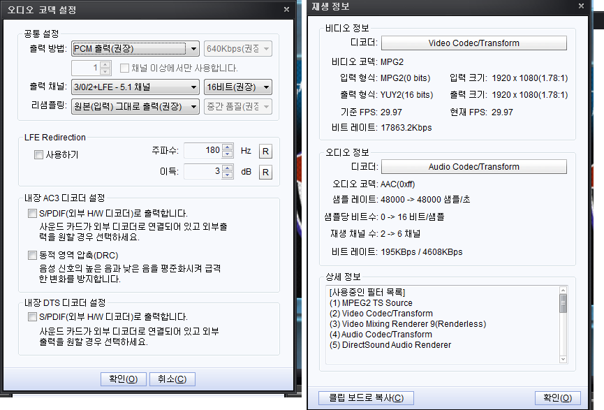 게다가 이렇게 설정할 경우 원본이 5.1ch인 파일에 ffdshow이 적용되어 2ch을 증폭한 것처럼 음향 분리가 제대로 이루어지지 않고 있습니다.
