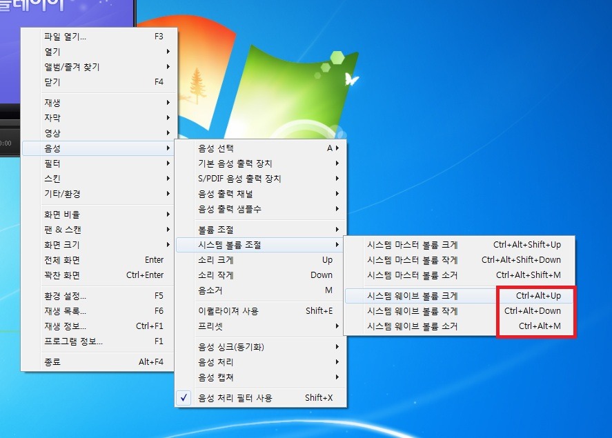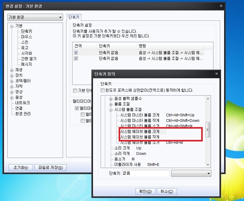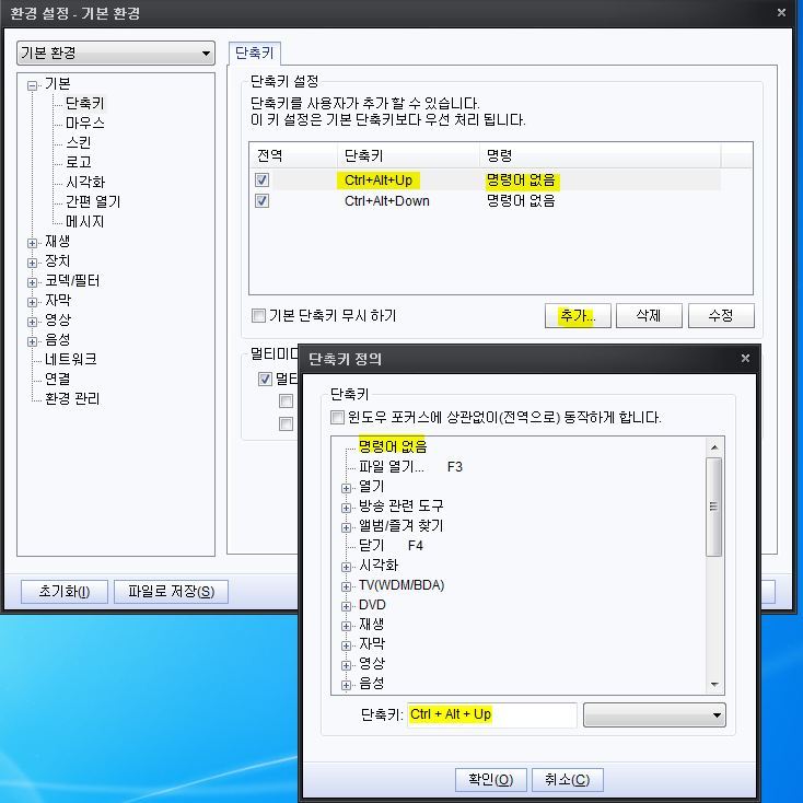 팟플레이어의 단축키를 변경하거나 없음으로 하려고 합니다.