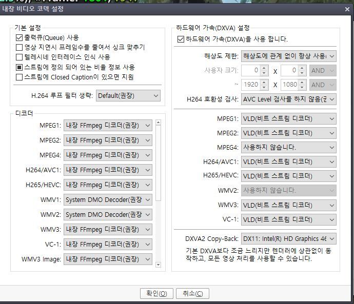 작성자킹팟 작성시간 15.08.20 초기화 후에 다른 부분은 건드리지 말고 dxva 만 체크하시고 나머지 설정은 자동으로 되도록 놓아두세요.