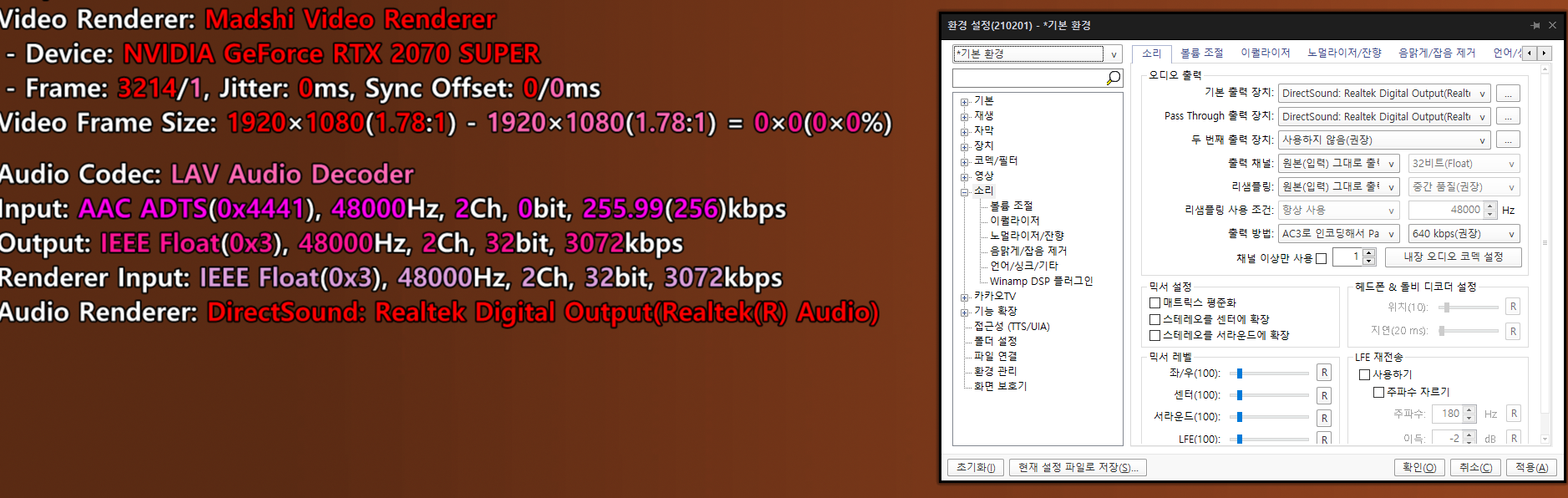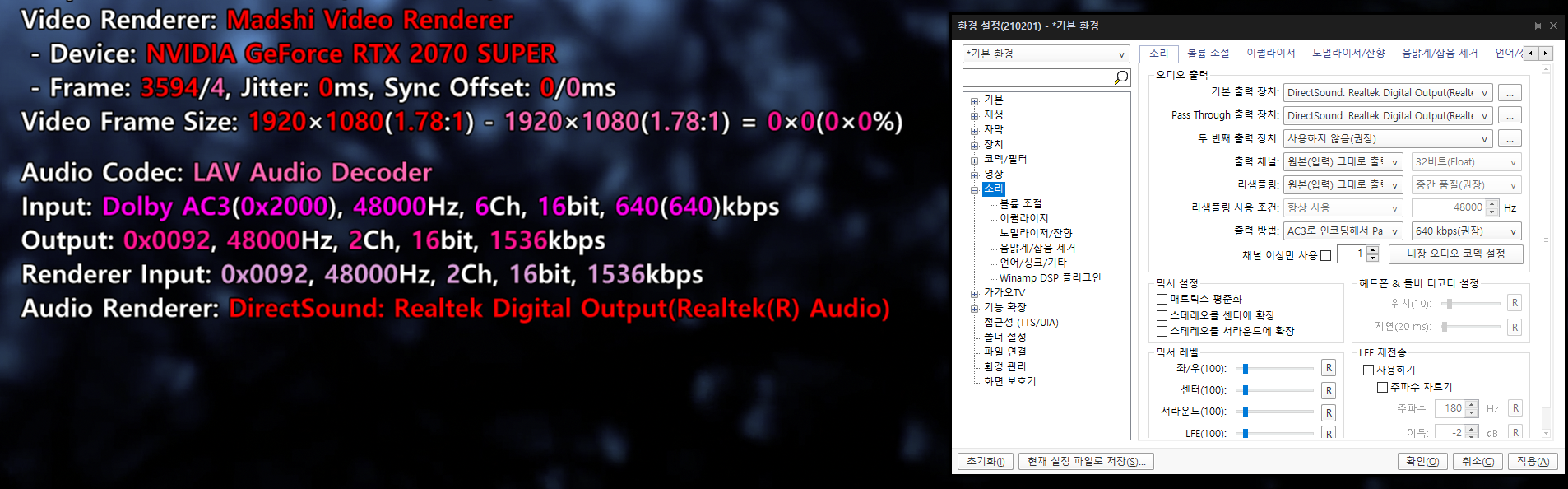 위 사진처럼 설정하고 ac3 코덱 파일과 aac 코덱 파일을 재생했는데....