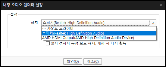주 사운드 드라이버를 선택 하면 출력 장치에 변화가 생기면 자동으로 출력 장치를 변경해 주는데, 출력 장치를 특정 장치로 지정하면 기본 출력 장치와는 상관 없이 선택된 장치로 출력이 됩니다.