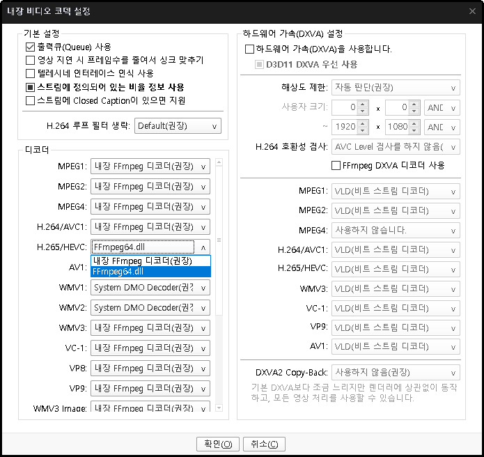 팟플레이어를 실행해보면 FFmpeg64.dll 선택이 없어서 선택할 수가 없네요