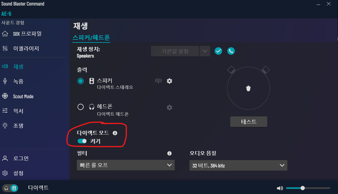 사운드블라스터 ae5 에서 다이렉트 모드 활성화 하면