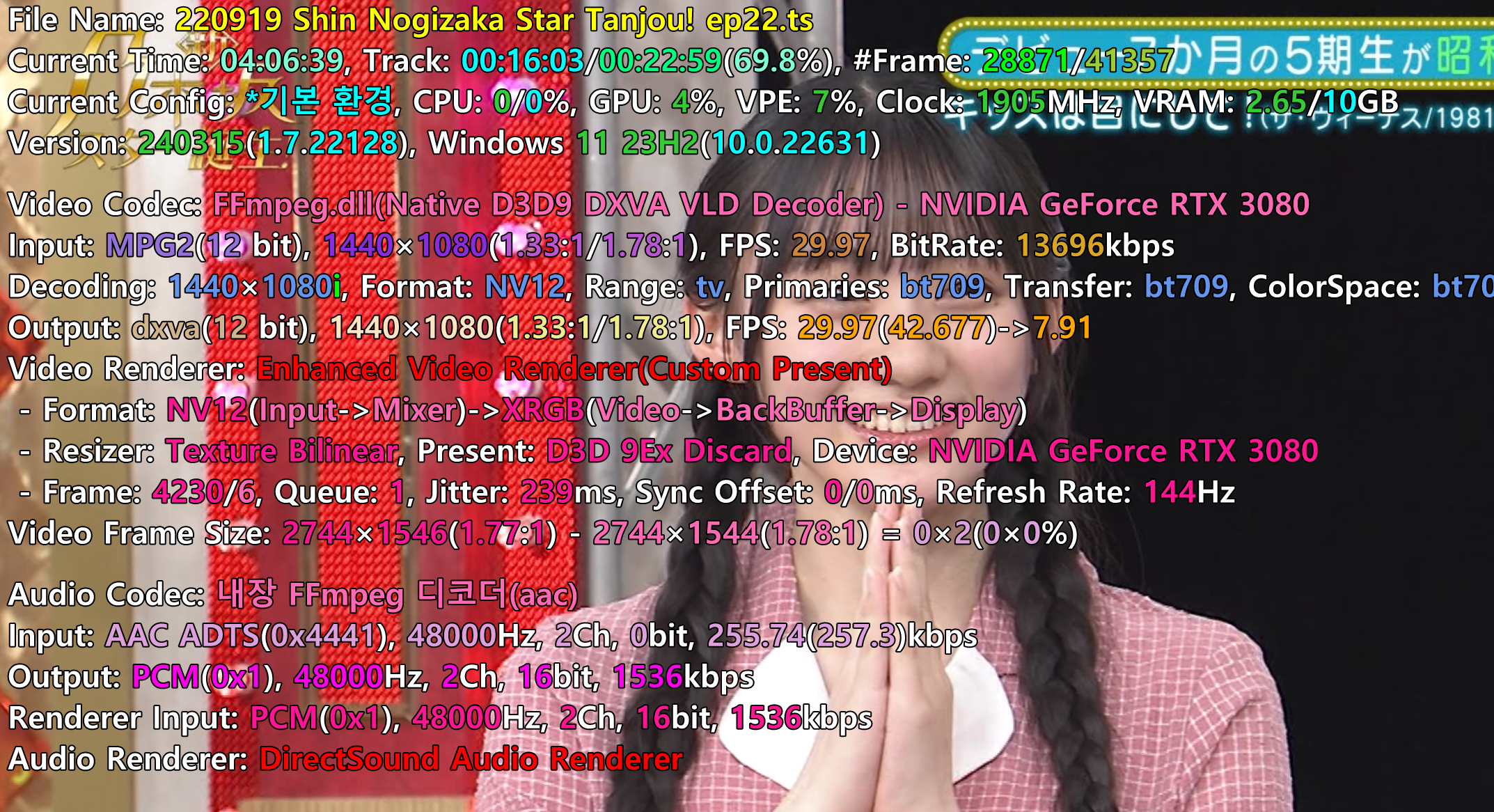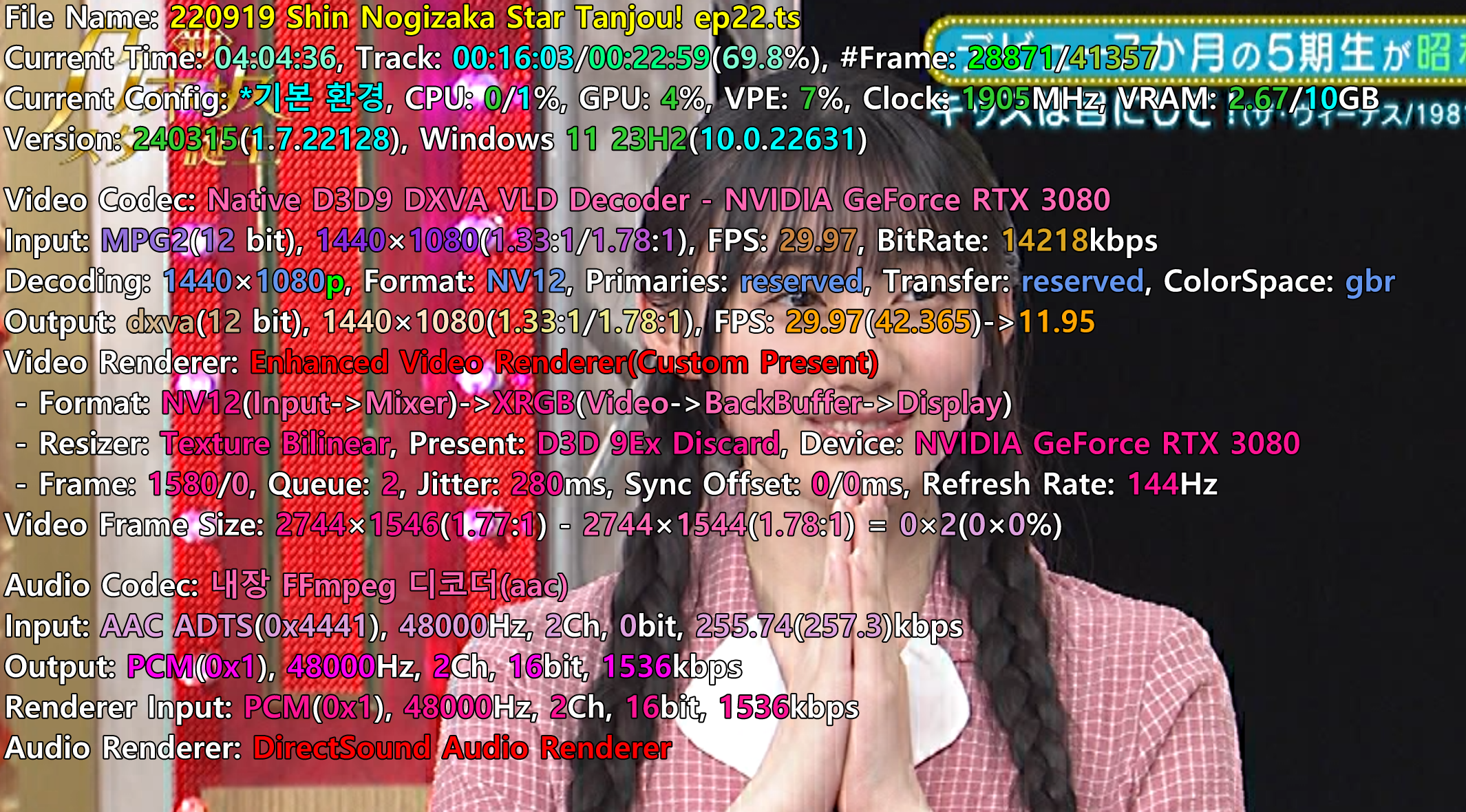 다음팟플레이어(32비트)로 TS파일을 실행했을 때 밑의 사진처럼 세로 줄이 생깁니다