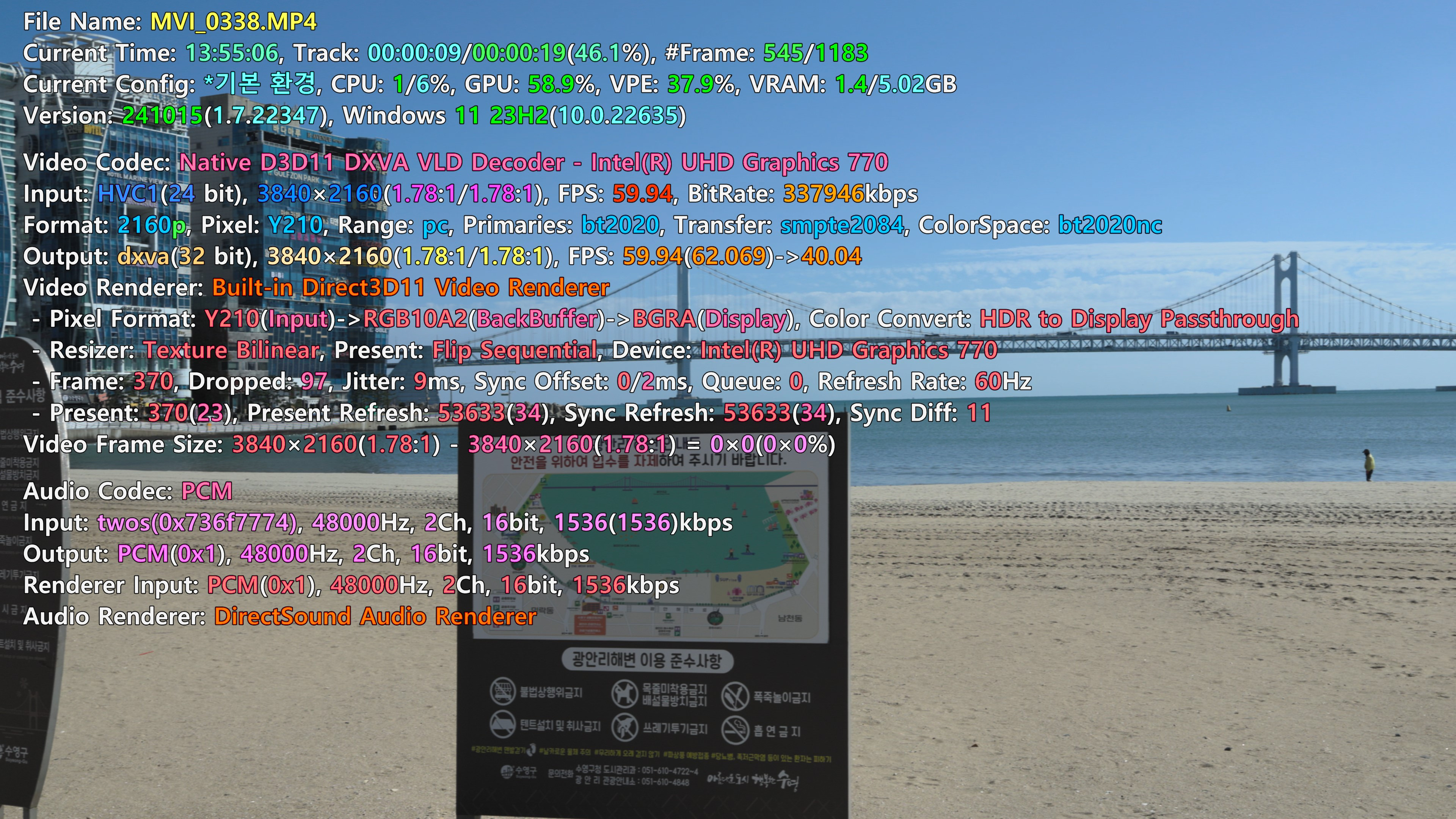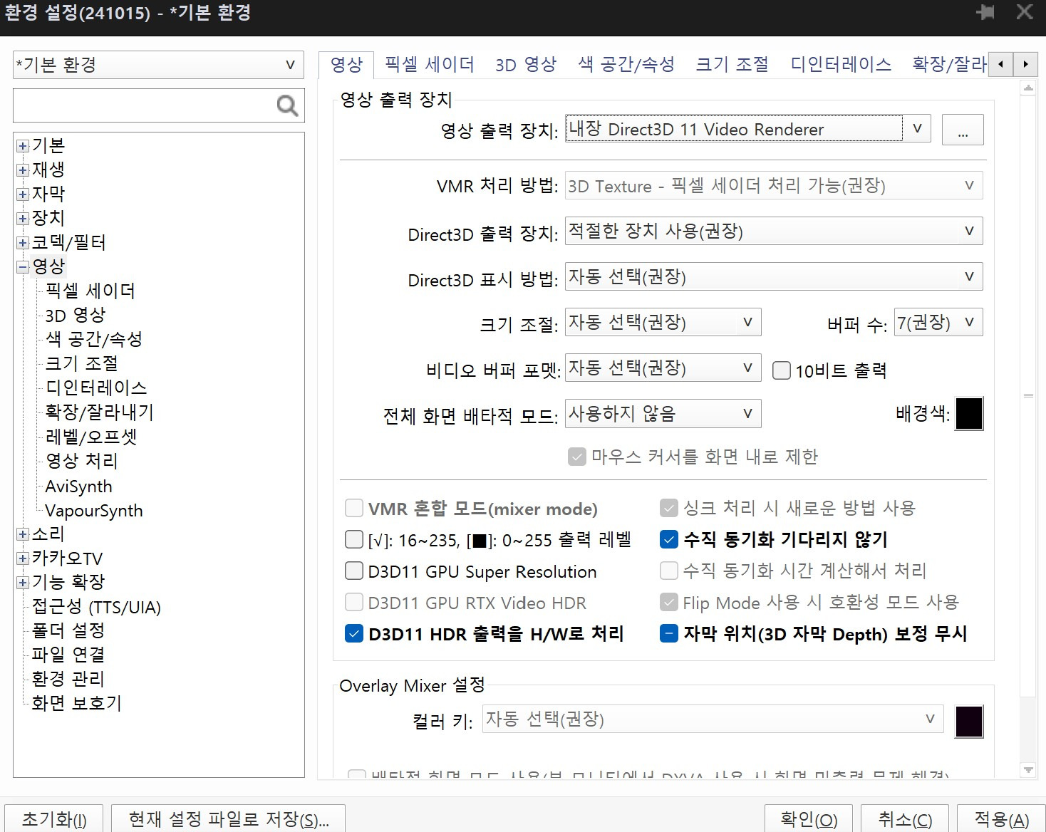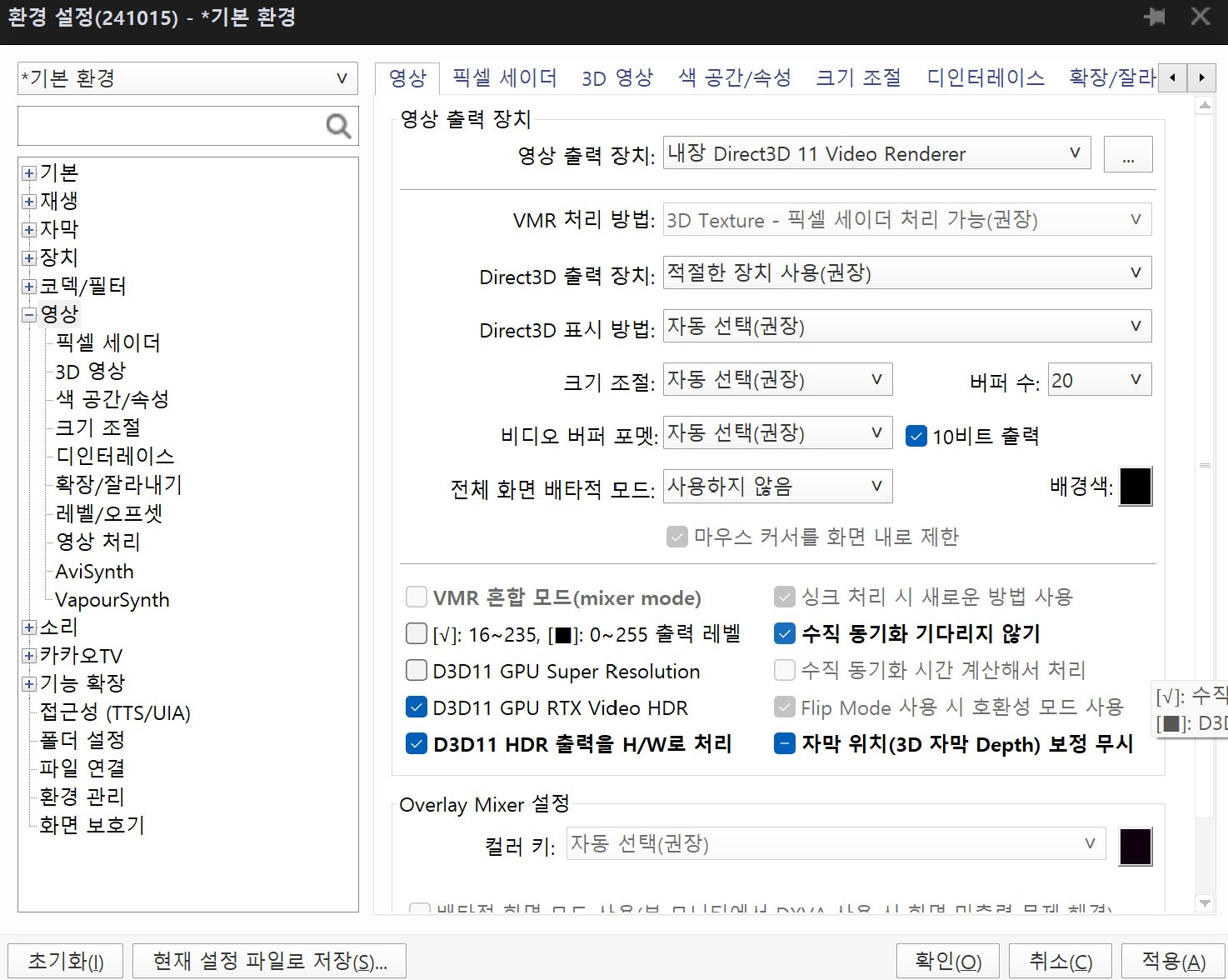 현재 설정은 이러합니다. 윈도우 11, 12600k, 팟플레이어 64bit입니다.
