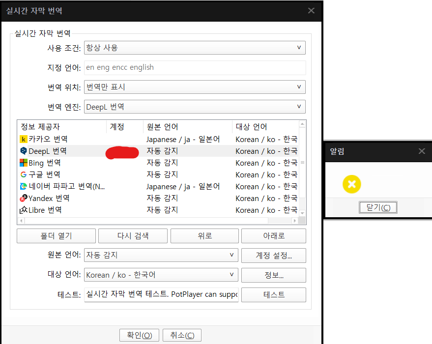 동일한 상태에서 카카오번역이나, 구글 번역 사용시에는 정상적으로 자막이 작동되나 DeepL 선택시 테스트에도 아무런 내용없이 공백으로 만 표기되고 실제 일어,영어 자막파일이 있는 영상을 재생 후 번역 선택을 하더라도 자막 원본 언어만 출력되고 번역이 되는 한국어는 나타나지 않습니다