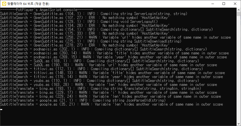 팟플레이어 설치된 파일에 가서 Extension\Subtitle 폴더에 들어가면 저 명령창 왼쪽에 보이는 ~.as 파일들이 있는데 저 파일들이 오류를 일으켜서 저 창이 뜬 거 같습니다