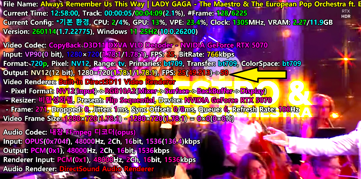 Nvidia 부드러운 모션는 VGA드라이버 차제적으로 동작이 되는거라 팟플레이어의 프레임 정보상은 그러한 기능에 대해서 알수가 없어서 그렇습니다.