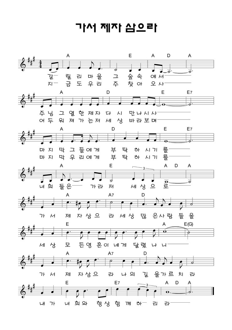 [스크랩] 가서 제자 삼으라 - 가스펠 복음성가(악보포함) 작성자기도하는 사람|작성시간10.07.12|조회수663 목록 댓글 0 글자크기 작게가 글자크기 크게가 1.갈릴리 마을 그 숲속에서 주님 그 열한제자 다시 만나시사마지막 그들에게 말씀하시기를 너희들은 가라 저 세상으로 <후렴>가서 제자 삼으라 세상많은 사람들을 세상 모든 영혼이 네게 달렸나니가서 제자 삼으라 나의 길을 가르치라 네가 너희와 항상 함께 하리라 2.지금도 우리 주 찾아오사어두워져 가는 저 세상 바라보며마지막 우리에게 부탁하시기를너희들은 가라 저 세상으로<후렴>가서 제자 삼으라 세상많은 사람들을 세상 모든 영혼이 네게 달렸나니가서 제자 삼으라 나의 길을 가르치라 네가 너희와 항상 함께 하리라 3.미류나무 우거지 그숲속에서 주님 젊은 제자들 다시 부르시사 마지막 그들에게 부탁 하시기를 너희들은 가라 저 세상으로 <후렴>가서 제자 삼으라 세상많은 사람들을 세상 모든 영혼이 네게 달렸나니가서 제자 삼으라 나의 길을 가르치라 네가 너희와 항상 함께 하리라 다음검색 스크랩 원문 : CCM 부르는소리 현재 게시글 추가 기능 열기 북마크 공유하기 신고 센터로 신고 댓글 댓글 0 댓글쓰기 답글쓰기 댓글 리스트