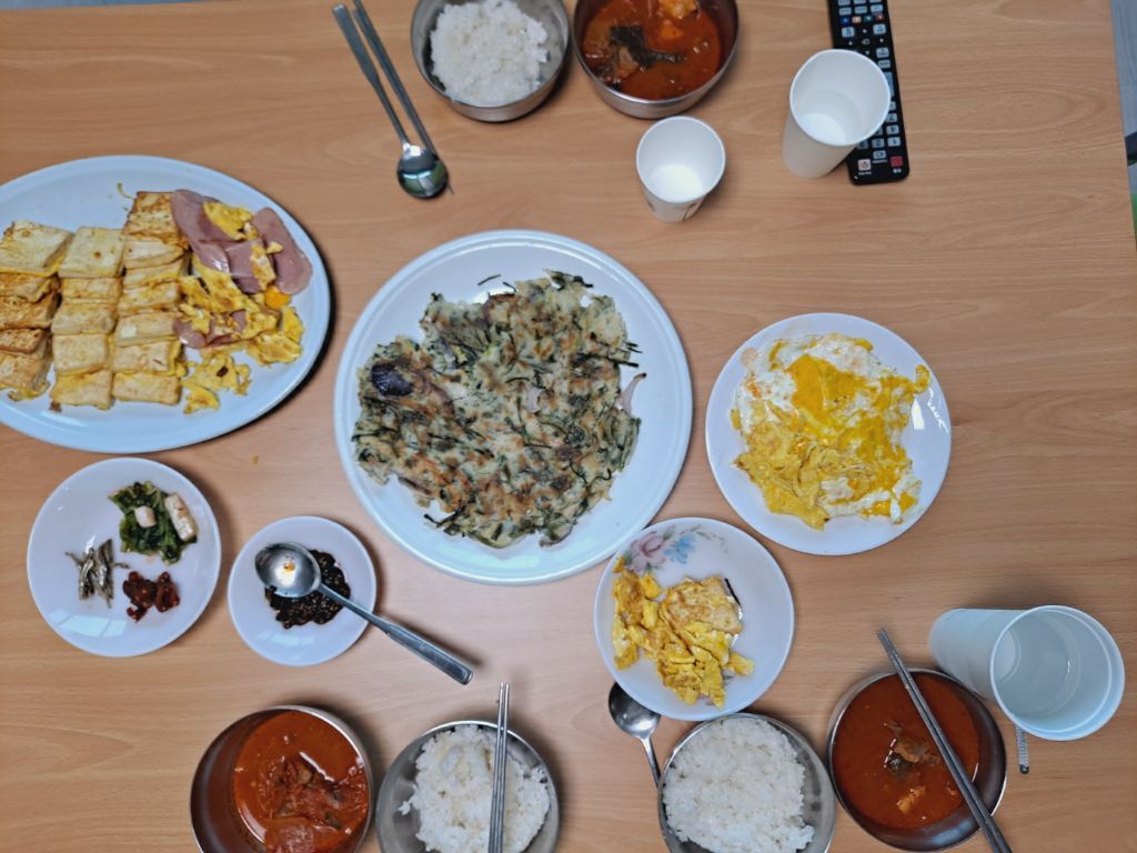 "미역국도 있고 매운 국(된장찌개)도있고 이것도 있고... 매운 거 좋아해요?" -영석