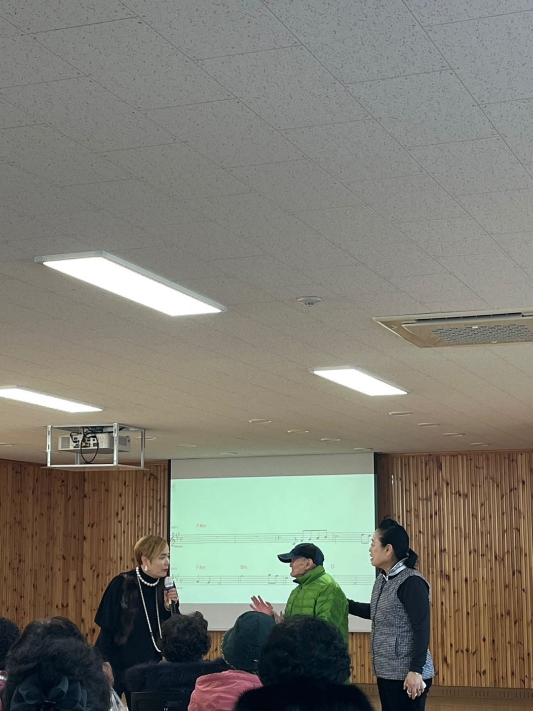 회장님께서 노래교실 수업을 진행하고 계시는 강사님께 대신 선물을 전달해 주셨다. 강사님께서는 고맙다고 하시며 아저씨를 앞으로 나오실 수 있도록 모셨다.