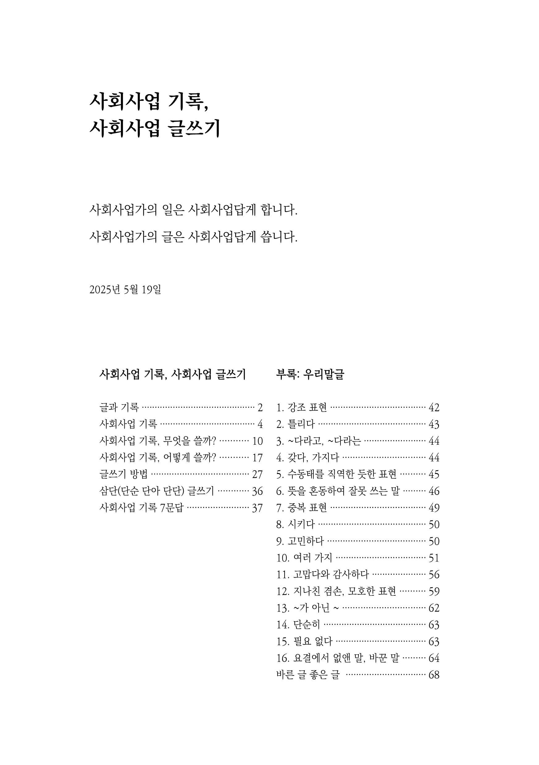 - 2025. 5. 17. '공감할 수 있는 글' 각주 추가, '당사자와 지역사회가 돋보이는 글' 부연 '당사자와 지역사회가 돋보이는 표현' 추가, '글쓰기 방법 2' 예문 글꼴 변경, '삼단(단순 단아 단단) 글쓰기' 간결하게 다듬기, '사회사업 기록 7문답' 내용 다듬기, 부적절한 표현 고쳐쓰기.
