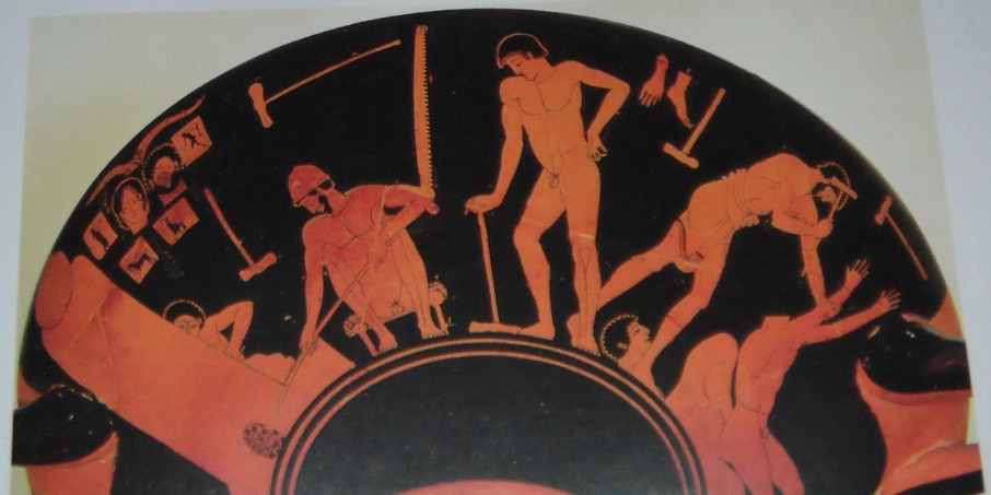 <그리스 조각가의 제작소>.기원전 480년경. 적회식 사발의 밑바닥에 그려져 있는 장면으로 왼쪽에는 벽에 스케치들을 붙혀 놓은 청동 주조소가 그려져 있고 오른쪽에는 머리가 없는 조각상을 손질하고 있는 사람이 그려져 있다. 조각상의 머리 부분은 바닥에 놓여 있다. 직경 30.5cm. 베를린 국립 박물관. 고 미술실