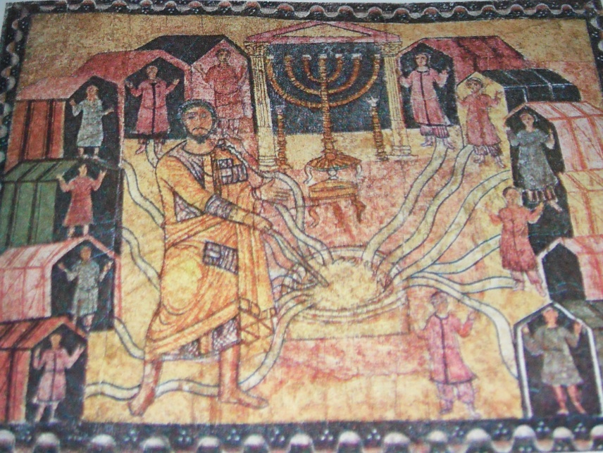 <바위에서 물이 솟아나게 하는 모세>. 245-56년경. 시리아의 고대도시 두라에우로포스(메소포타미아)의 유태교 회당의 벽화