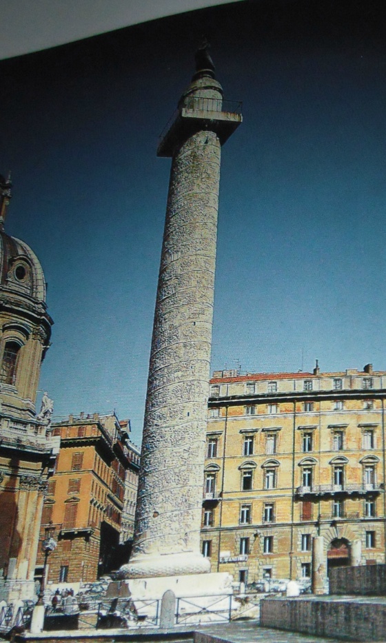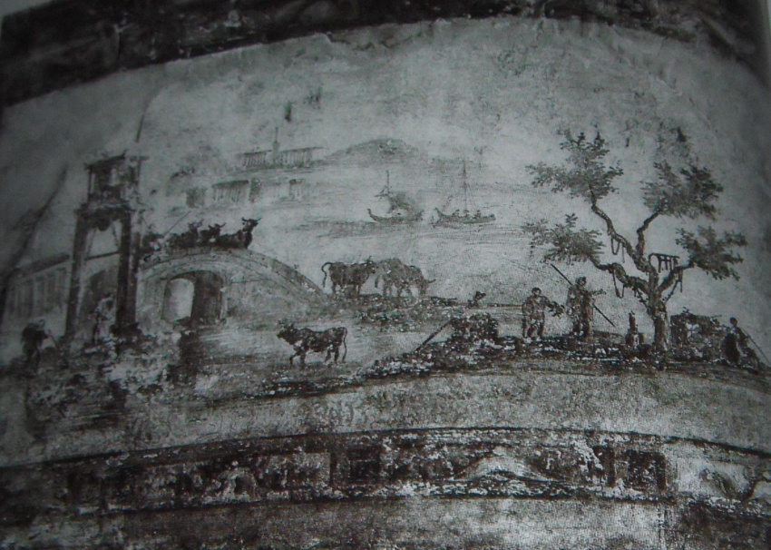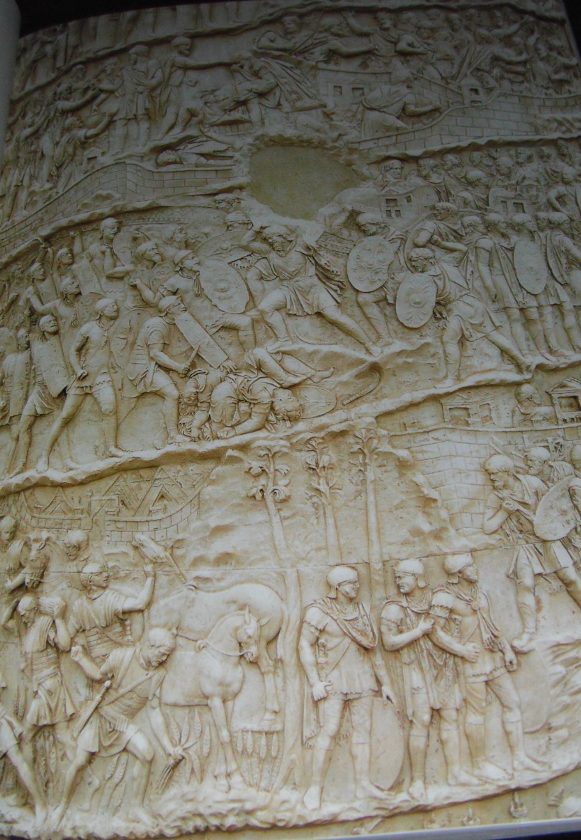 도판 77의 세부 : 맨위는 도시의 함락을 보여주며 중앙은 다키아 군과의 전투를 보여주고, 맨 아래는 요새 밖에 있는 곡초를 베는 병사들을 보여준다.