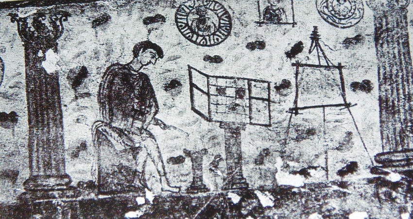 <물감통과 이젤을 옆에 두고 앉아 '장례용 초상화'를 그리는 제작소의 화가>. 100년경. 크리미아에서 출토된 석관에 그려진 그림