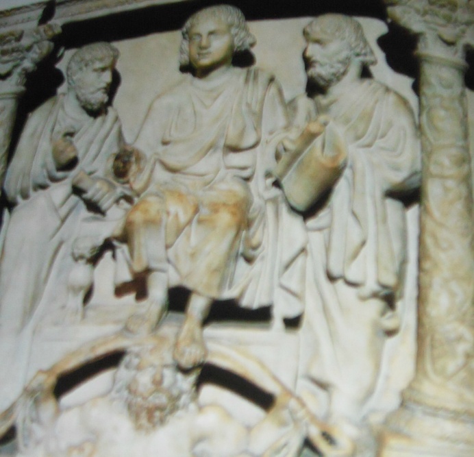 <성 베드로와 성 바오르를 거느린 그리스도>.389년경.대리석 부조. 유니우스 밧수스의 석관의 일부. 로마 성 베드로 성당 납골소