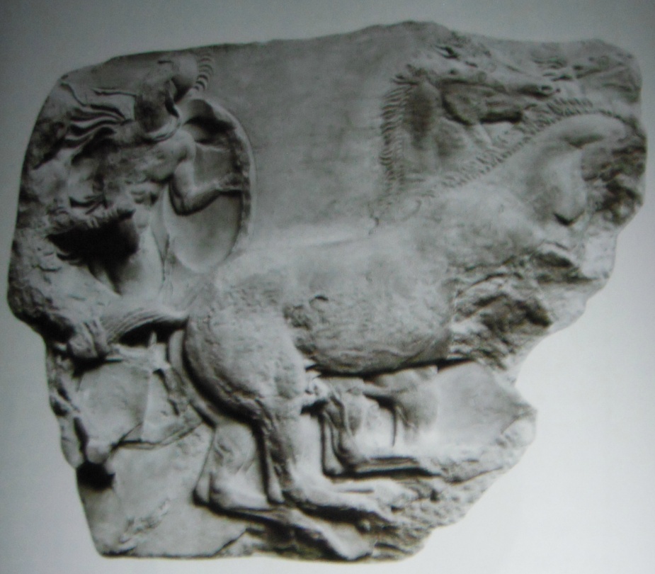 <전차 경주자>. 기원전440년경. 파르테논 신전의 대리석 프리즈 일부. 런던 대영 박물관