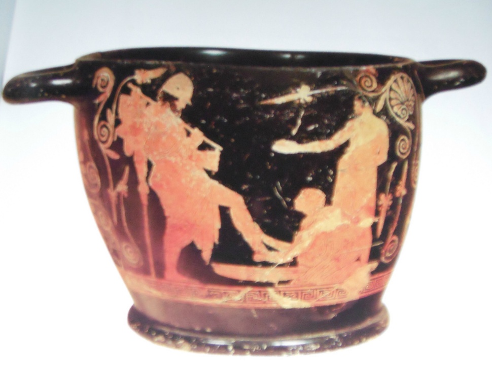 <율리시스와 그를 알아본 늙은 유모>. 기원전 5세기. 적회식 도자기.높이 20,5cm. 키우시 국립 고고학 박물관