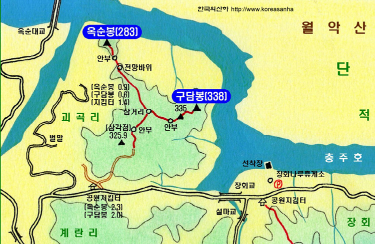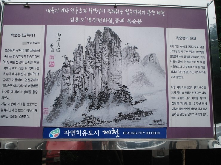 월악산국립공원에 속해 있는 『옥순봉(玉筍峯)』은 제천시 수산면 괴곡리에 있다. 제천 10경 중 8경에 속하는 옥순봉은 지리적인 이유로 구담봉과 함께 단양 8경에 속하기도 한다. 경관이 뛰어나 소금강이라고도 한다. 희고 푸른 여러 개의 봉우리가 마치 대나무 싹과 같다고 하여 옥순봉이라고 이름 붙였다. 옥순봉의 산세는 청풍호와 어우러져 뛰어난 경관을 자랑한다. 해발 283미터의 낮은 산이지만 정상에서 아래를 내려다보면 아찔함마저 느낀다. 확 트인 정상부는 너른 안부와 암릉으로 이루어져 있어 쉬어가기 좋다. 또한 노송이 운치를 더해주니 그 옛날 선계가 부럽지 않을 곳이 바로 이 곳이라 하겠다. 산행과 더불어 유람선을 타고 옥순봉과 구담봉의 멋들어진 석벽을 조망하는 것도 추천할 만하다. 옥순봉은 높이가 낮은데다 등산로도 정비가 잘 되어 있어 쉽게 오를 수 있으니 1시간 산행이면 충분하다. 그러나 구담봉을 연결해 산행할 경우에는 약 4시간은 잡아야 한다. 구담봉으로 가려면 옥순봉 정상에서 되내려와 왼쪽으로 난 길로 가야 한다. 정상부까지는 깎아지른 바위산으로 이루어져 있으므로 주의해야 한다. 옥순봉-구담봉 산행 중에는 식수를 구할 수 없으므로 산행 시작전 미리 준비해야 한다 『구담봉(龜潭峰)』 단양팔경에 속하는 산으로 물 속에 비친 바위가 거북 무늬를 띠고 있어 붙여진 이름이다. 높이는 330m이며 명승 제 46호로 지정되었다(2008년 9월 9일 지정). 충주시에서 단양읍을 향해 가다 보면 거북 한 마리가 뭍으로 올라가는 듯한 형상의 이 산이 보인다. 아담한 규모의 산으로 옥순봉과 함께 충주호 수상관광의 백미를 이루며 호수에서 보는 절경 못지 않게 산행코스 또한 아기자기하다. 구담봉 옆에는 유명한 옥순봉이 있으며 제비봉과 금수산, 멀리는 월악산이 감싸고 있어 충주호 수운관광의 최절정지로 손꼽히고 있다. 퇴계 이황은 구담봉의 장관을 보고 "중국의 소상팔경이 이보다 나을 수는 없을 것"이라고 극찬했다고 한다. 조선 인종 때 백의 재상 이지번이 벼슬을 버리고 이곳에 은거했는데 푸른 소를 타고 강산을 청유하며 칡덩굴을 구담의 양안에 매고 비학을 만들어 타고 왕래하니 사람들이 이를 보고 신선이라 불렀다는 이야기도 전해져 온다. 『사인암(査人巖)』단양팔경 중 하나로 푸른 계곡을 끼고 있는 70m 높이의 기암절벽이다. 고려 말의 학자 우탁(1263~1343년) 선생이 정4품 ‘사인재관’ 벼슬에 있을 때 휴양하던 곳이라 해서 사인암이라 불리게 되었다. 기암절벽 위에 서 있는 노송이 멋스러우며 우탁 선생이 직접 새긴 ‘뛰어난 것은 무리에 비유할 것이 없으며 확실하게 빼지 못한다. 혼자서도 두려운 것이 없으며 세상에 은둔해도 근심함이 없다’는 뜻의 글씨가 암벽에 남아 있다.