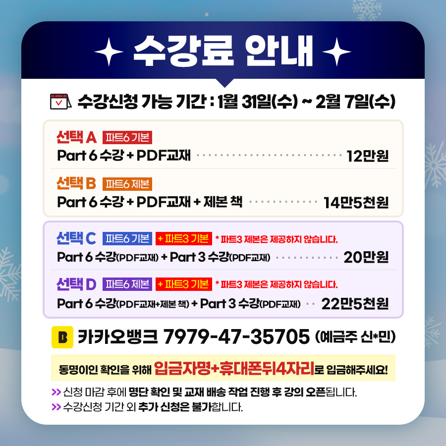 ▷ 교재 : 강의록 PDF 기본제공, 강의록 제본 추가(선택) - Part3은 제본책X