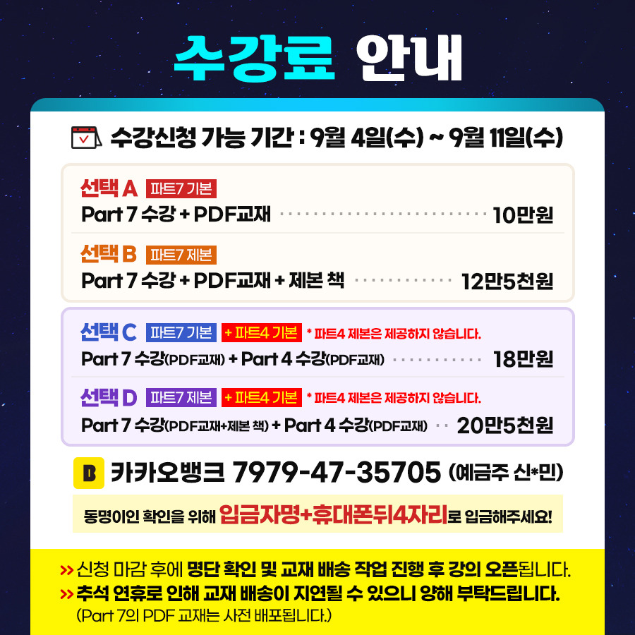 ▷ 교재 : 강의록 PDF 기본제공, 강의록 제본 추가(선택) - Part4은 제본책X