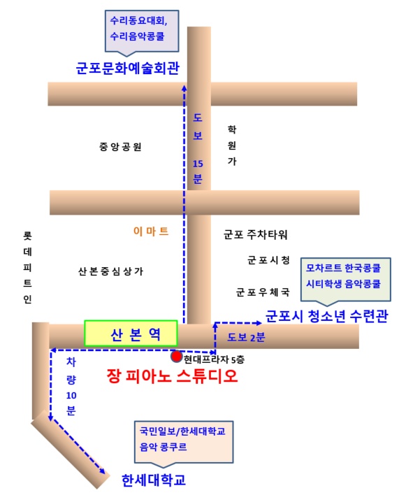 4호선 산본역 1분, 군포문화예술회관 5분, 한세대 10분, 안양대, 성결대, 안양예고 근거리