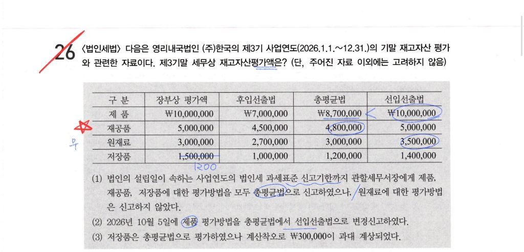 재고 평가 질문드려요 작성자qkqkaqk7|작성시간26.04.15|조회수111 목록 댓글 3 글자크기 작게가 글자크기 크게가 여기서 재공품은 왜 임의변경인가요..??3기라서 총평균으로 평가해야된다고 생각했어요 ㅠㅠ 다음검색 현재 게시글 추가 기능 열기 북마크 공유하기 신고 센터로 신고 댓글 댓글 3 댓글쓰기 답글쓰기 댓글 리스트 작성자bill917 | 작성시간 26.04.15 new 총평균법으로 당초 적법하게 신고하였으나 회사가 선입선출법으로 계상을 했기에 임의변경이 됩니다 작성자젠드깅 | 작성시간 26.04.15 new 4,800,000으로 신고했어야 하는데 계산 착오 없이 5,000,000으로 신고한거잖아용 그래서 임의변경입니당 작성자qkqkaqk7 작성자 본인 여부 작성자 | 작성시간 26.04.15 new 두분 다 감사합니다 !! 댓글 전체보기