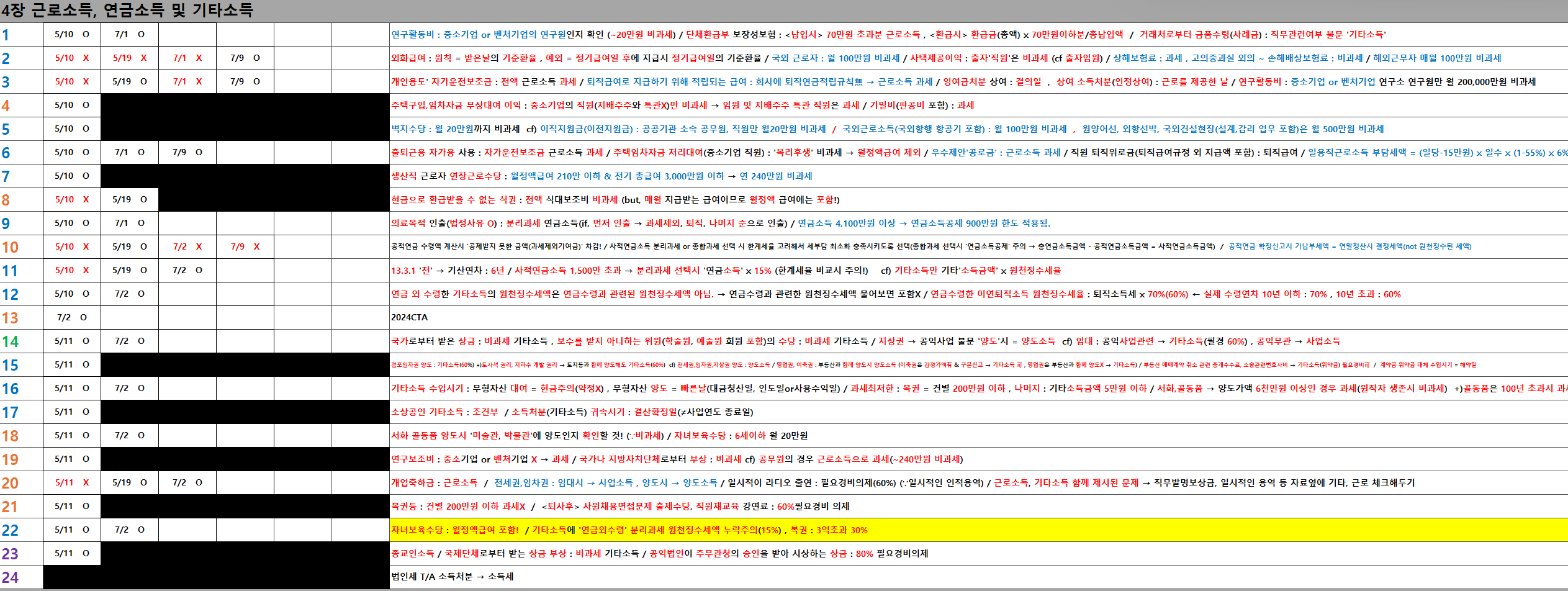 번호 색깔은 주민규 연습서 기준 기본, 필수, 심화, 최상 등 난이도별 구분이고, 그다음은 문제 풀이를 한 날짜, 그다음은 문제에서 기억해두어야할 포인트, 또는 실수한 부분에 대한 요약입니다. 저는 가로풀기는 진행하지 않았고, 세로풀기만 진행했습니다. 따라서 오늘 사업소득을 풀었다면, 적어도 2~3주 뒤에 사업소득을 접하게 되는 것입니다. 이 부분이 너무 불안했고, '최대한 적은 시간을 투입하면서 사업소득을 푼 오늘의 나의 실력을 유지할 수 있는 방법은 없을까?' 라는 생각에서 엑셀을 이용하기 시작했습니다. 아까 형광펜 칠해둔 것은 비교적 빠른 시일 내 복습을 한다면 기억이 잘 나는 반면, 매일 사업소득만 복습할 수는 없는 노릇이기에 결국 점차 망각되기 마련입니다. 그래서 간단하게 한줄로 엑셀에다가 정리를 해 매일 각 과목 시작 전 과목별 엑셀파일을 20분 정도 정독을 하고 공부를 시작했습니다. 이렇게 하면, 꾸준히 각 파트별 실력을 유지해두면서 진도를 나갈 수 있다고 생각해 위와 같은 공부방법을 사용했습니다.
