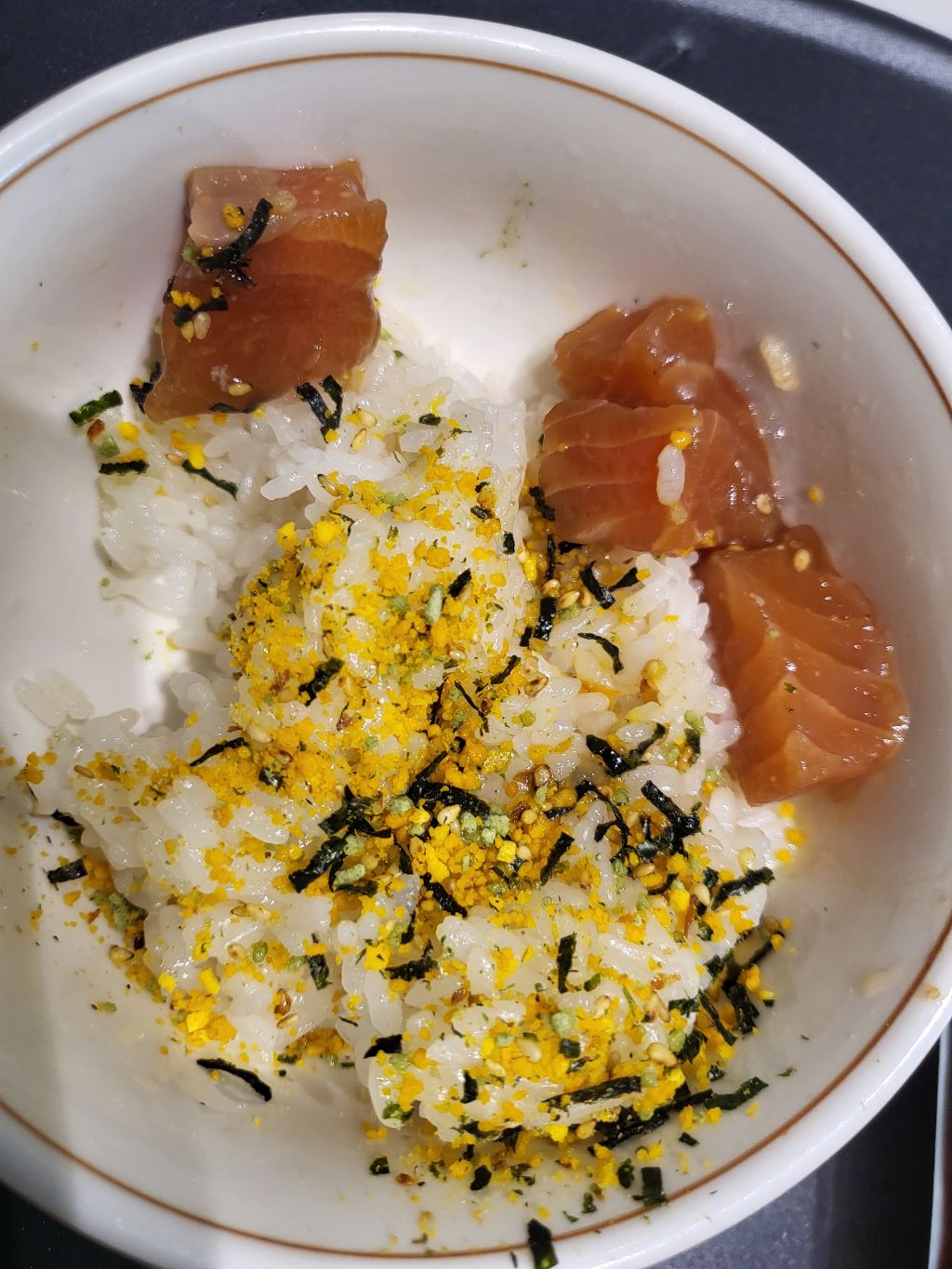 후리가케 뿌린밥에 연어장 올려 이른저녁해결