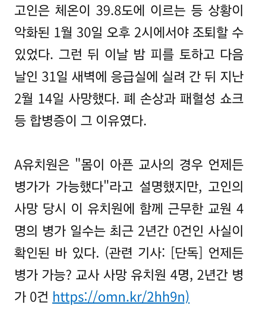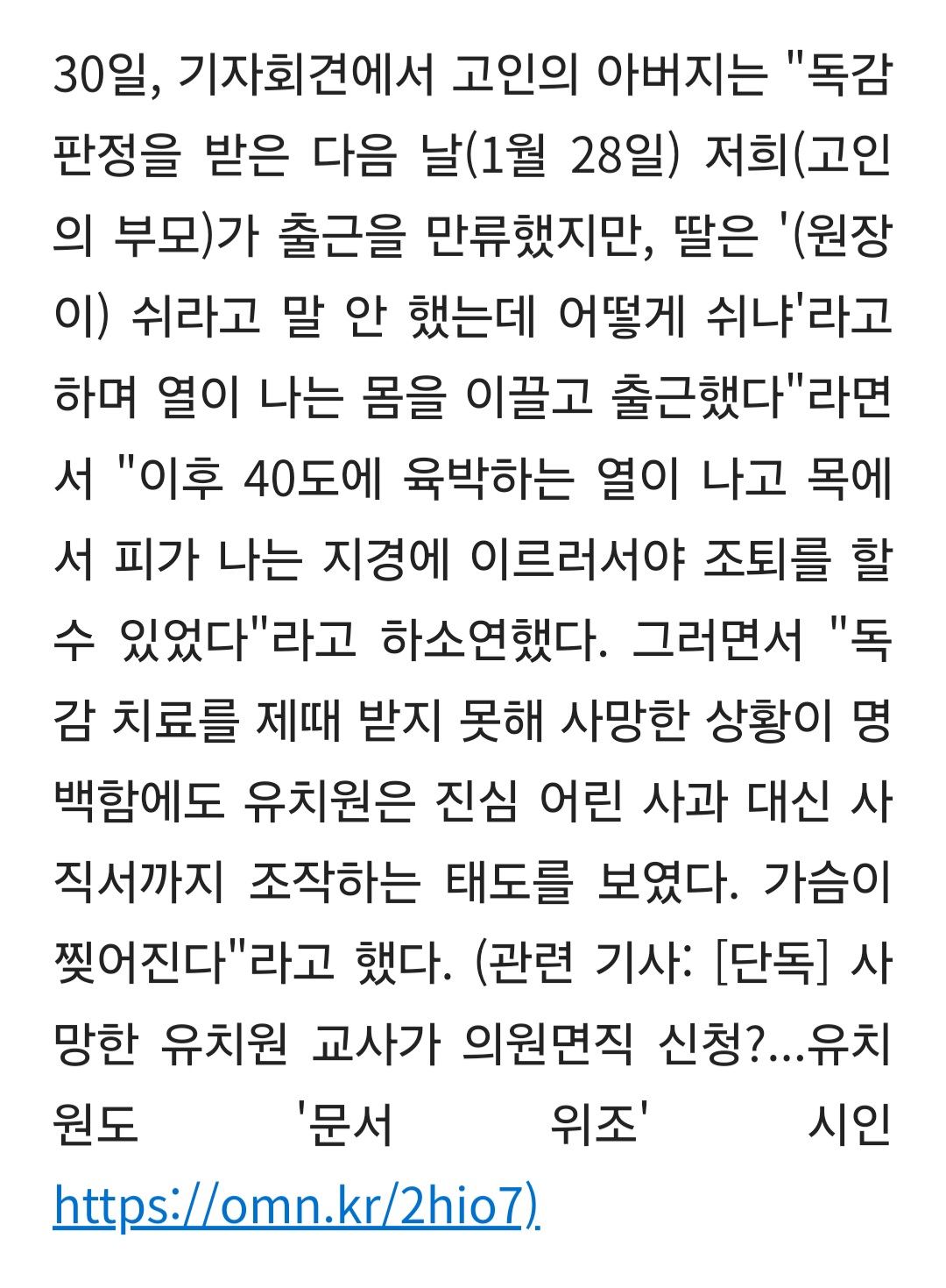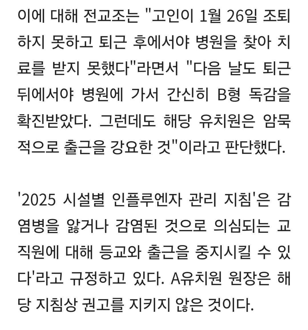 작성자맘회원님 작성시간 26.03.30 아 진짜 안타깝네요. 중형 병원 응급실 가면 타미플루 수액 놔주는데. 밤에라도 가지 ㅜㅜ저럴 줄 몰랐겠죠. 너무 안타깝네요. 젊은 사람이 독감 하루 만에 피 토하고 죽었네요 저럴 때. 대체인력없으면 원장 원감이 저 반 아이들을 봐줘야 되는데ᆢ 눈치주는 분위기네요.