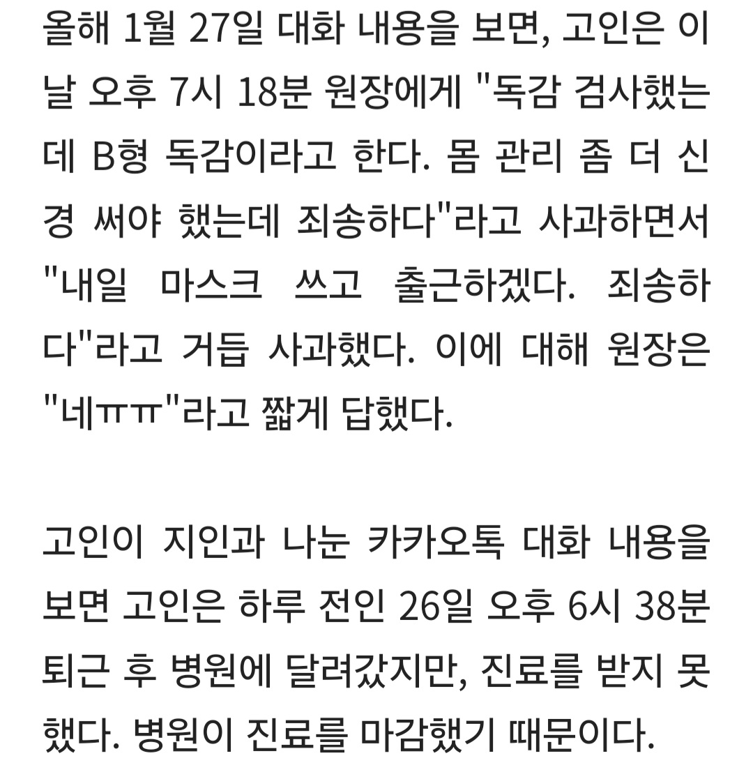 답댓글 작성자맘회원님 작성시간 26.03.30 그렇게 이야기할수밖에 없는 분위기를 말하는거에요. 웬만하면 출근하겠단 의지를 보이는거죠. 저분도 당장 죽을것같진 않으니 저렇게 말한거겠죠. 하지만 몸상태가 급격히 안좋아진 경우에 해당할거구요