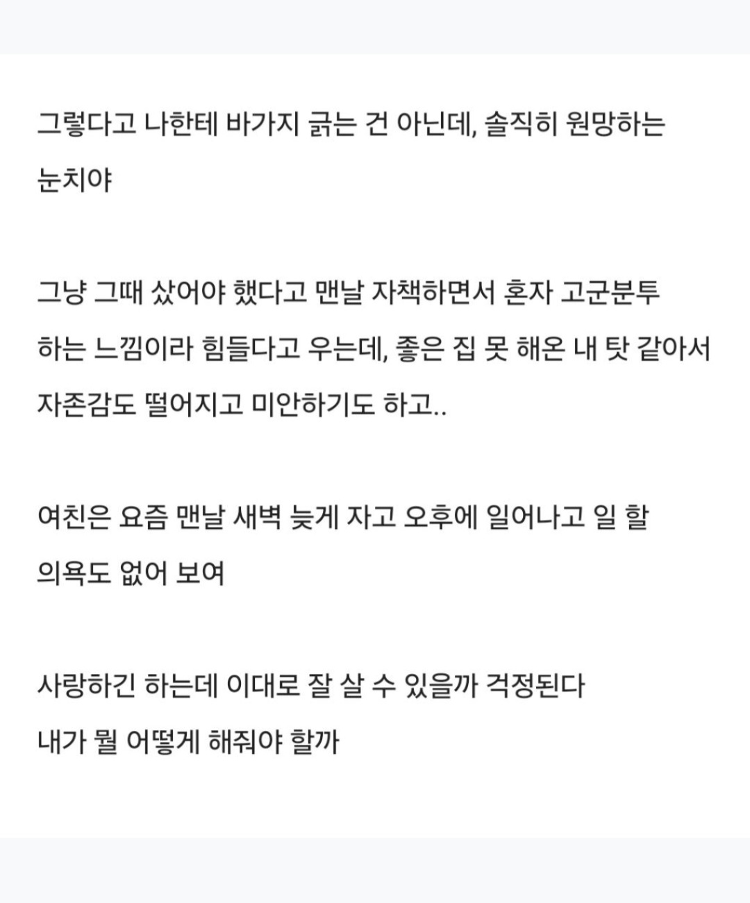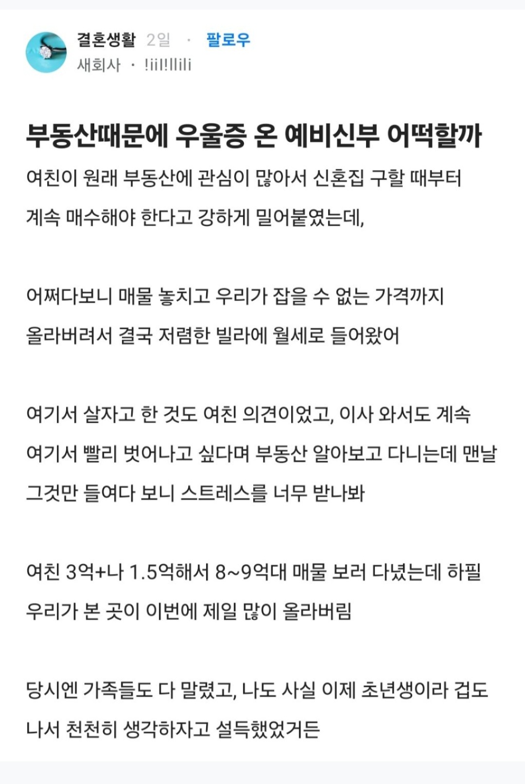 작성자맘회원님 작성시간 26.04.02 아직 결혼전이면 헤어지라고 말해주고싶네요. 남자가 넘 능력이 없네