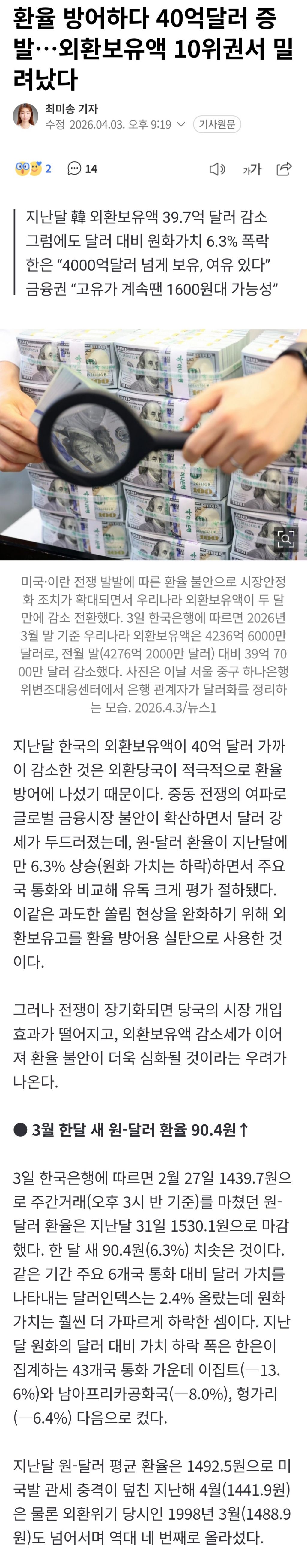 세계 12위 수준…환율방어 등에 3월 외환보유액 40억달러 ‘뚝’ 작성자맘회원님|작성시간26.04.03|조회수165 목록 댓글 15 글자크기 작게가 글자크기 크게가 https://naver.me/54KtUXAJ세계 12위 수준…환율방어 등에 3월 외환보유액 40억달러 ‘뚝’지난달 외환보유액이 달러 강세와 환율 변동성 관리 등의 영향으로 40억달러 가까이 줄어든 것으로 나타났다. 3일 한국은행에 따르면 3월 말 기준 우리나라 외환보유액은 4236억6000만달러(약 641조n.news.naver.comhttps://naver.me/xeFH7CFy환율 방어하다 40억달러 증발…외환보유액 10위권서 밀려났다지난달 한국의 외환보유액이 40억 달러 가까이 감소한 것은 외환당국이 적극적으로 환율 방어에 나섰기 때문이다. 중동 전쟁의 여파로 글로벌 금융시장 불안이 확산하면서 달러 강세가 두드러n.news.naver.com 다음검색 현재 게시글 추가 기능 열기 북마크 공유하기 신고 센터로 신고 댓글 댓글 15 댓글쓰기 답글쓰기 댓글 리스트 작성자맘회원님 | 작성시간 26.04.03 위기네 위기 외환위기 답댓글 작성자맘회원님 | 작성시간 26.04.03 ㅇㅇ 답댓글 작성자맘회원님 | 작성시간 26.04.03 나라 망하자 쨎재앙 보유국 답댓글 작성자맘회원님 | 작성시간 26.04.04 나라 망하길 바라는 못된 토착왜구들 관리자에 의해 규제된 글입니다. 댓글 전체보기