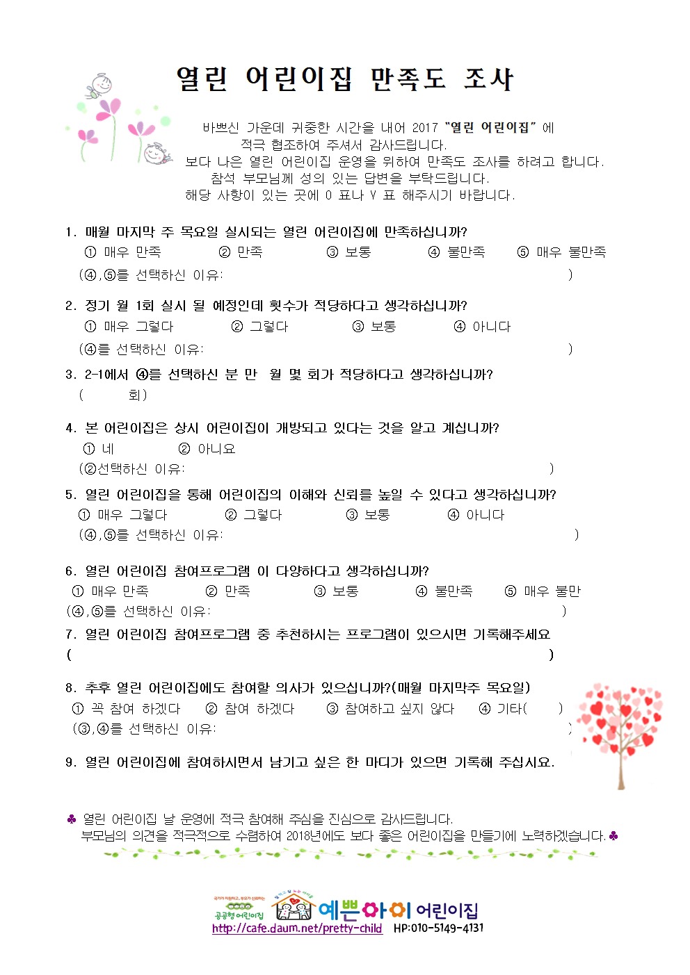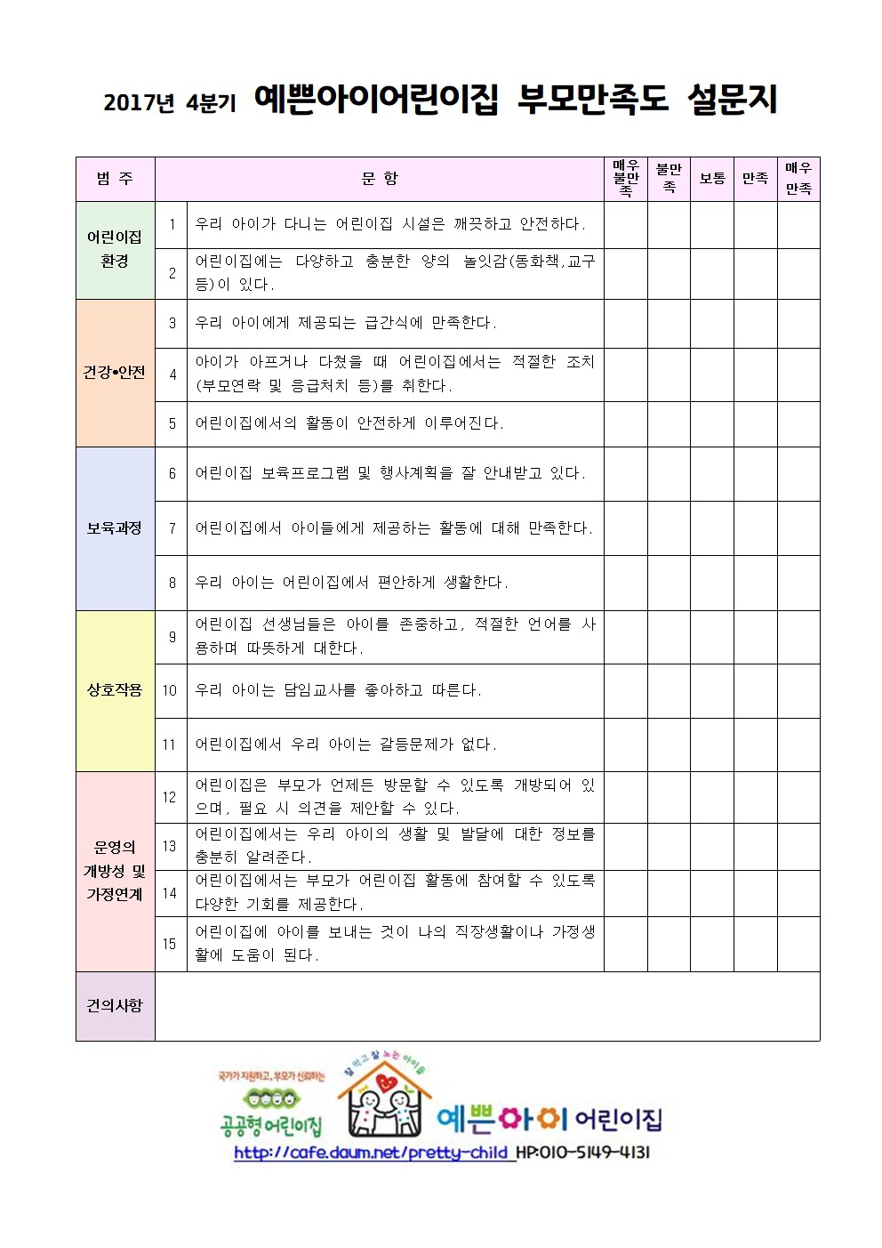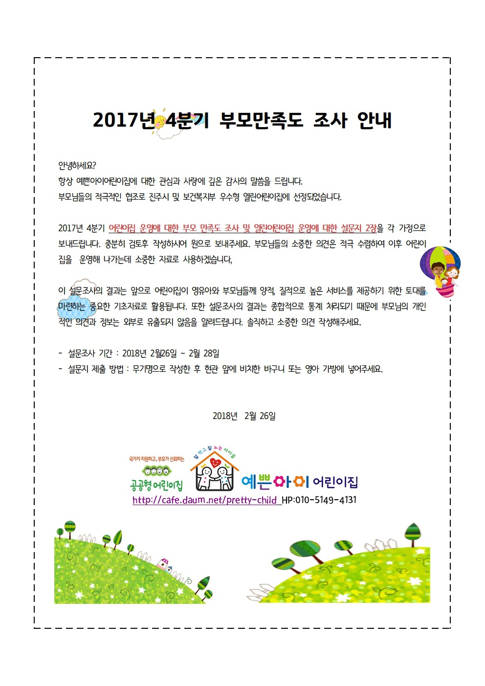 20174분기 어린이집 운영에 대한 부모 만족도 조사 및 열린어린이집 운영에 대한 설문지 2을 각 가정으로 보내드립니다. 충분히 검토후 작성하시어 원으로 보내주세요. 부모님들의 소중한 의견은 적극 수렴하여 이후 어린이집을 운영해 나가는데 소중한 자료로 사용하겠습니다,