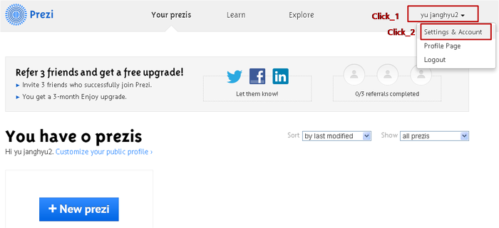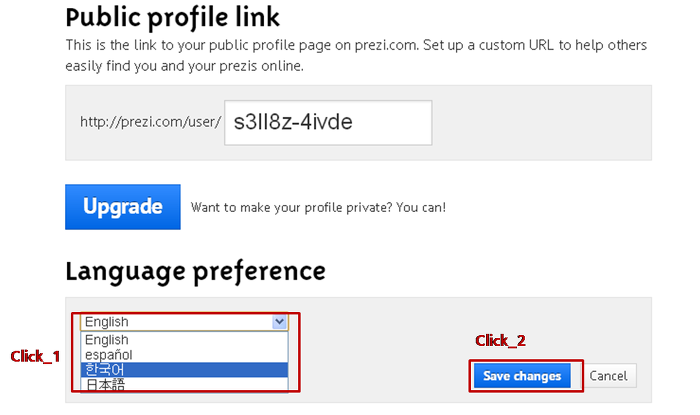 프레지 아는 만큼 보인다 _ 프레지 한글 언어 설정 & 저장용량 확인 프레지 사이트와 프레지 편집 메뉴가 한글이 아닌 영문으로 보인다면 언어 설정을 한국어로 변형해야 합니다. 1. 프레지 사이트에 로그인한 상태에서 내 계정 이름 클릭 > settings&account 클릭 2. 중간 정도에 있는 Language Preference에 영어로 되어 있는 부분을 한국어로 변경 > 저장 버튼 꼭 save changes를 눌러야지만 변경이 됩니다. 저장버튼을 누르면 언어 변환이 완료됩니다. 3. 내 저장 공간이 얼마나 남았는지 확인하는 곳도 이곳 settings&account입니다. 계정 & 라이선스 정보를 보면 내 용량이 얼마 남았는지 확인할 수 있습니다. |