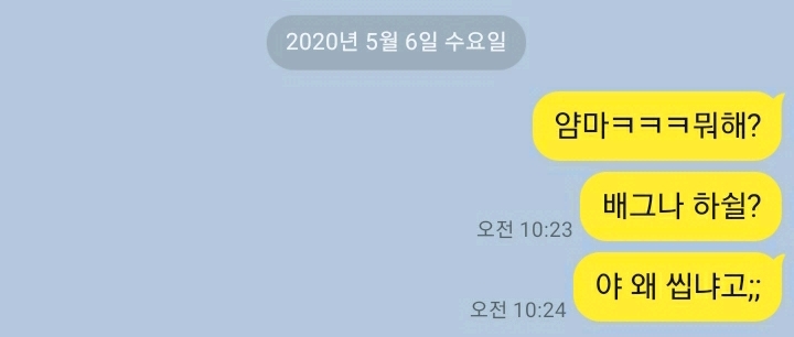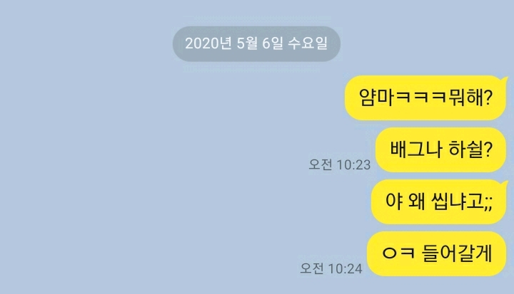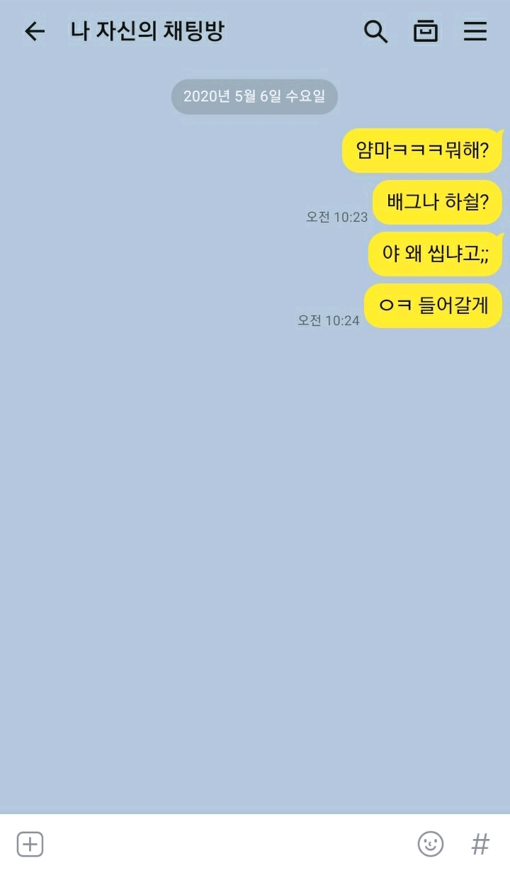 카톡으로 재밌게 노는 법(?) 작성자후루하시|작성시간20.05.06|조회수2,006 목록 댓글 19 글자크기 작게가 글자크기 크게가 평화롭지 않은 오늘 오전난 친구한테 배그를 하자고 했다하지만 친구는 씹었다나는 왜 씹냐고 말했더니 친구가 말했다맞다 이거는 카카오톡의나와의 채팅 기능이다 다음검색 현재 게시글 추가 기능 열기 북마크 공유하기 신고 센터로 신고 댓글 댓글 19 댓글쓰기 답글쓰기 댓글 리스트 답댓글 작성자후루하시 작성자 본인 여부 작성자 | 작성시간 20.05.06 ?????? 작성자뀨흐헤 | 작성시간 20.05.06 ㅋ..ㅋㅋㅋ.... 작성자페코빠돌이 쯔 | 작성시간 20.05.06 ㅋㅋㅋㅋㅋㅋㅋㅋㅋㅋㅋㅋㅋㅋㅋㅋㅋㅋㅋㅋㅋㅋㅋㅋㅋㅋㅋㅋㅋㅋ 이미지 확대 작성자안해 | 작성시간 20.05.06 님 친없....읍읍 퍽퍼벅퍽 작성자OwOb | 작성시간 20.05.06 https://www.youtube.com/watch?v=1GvdRZj5y_U 동영상 댓글 전체보기