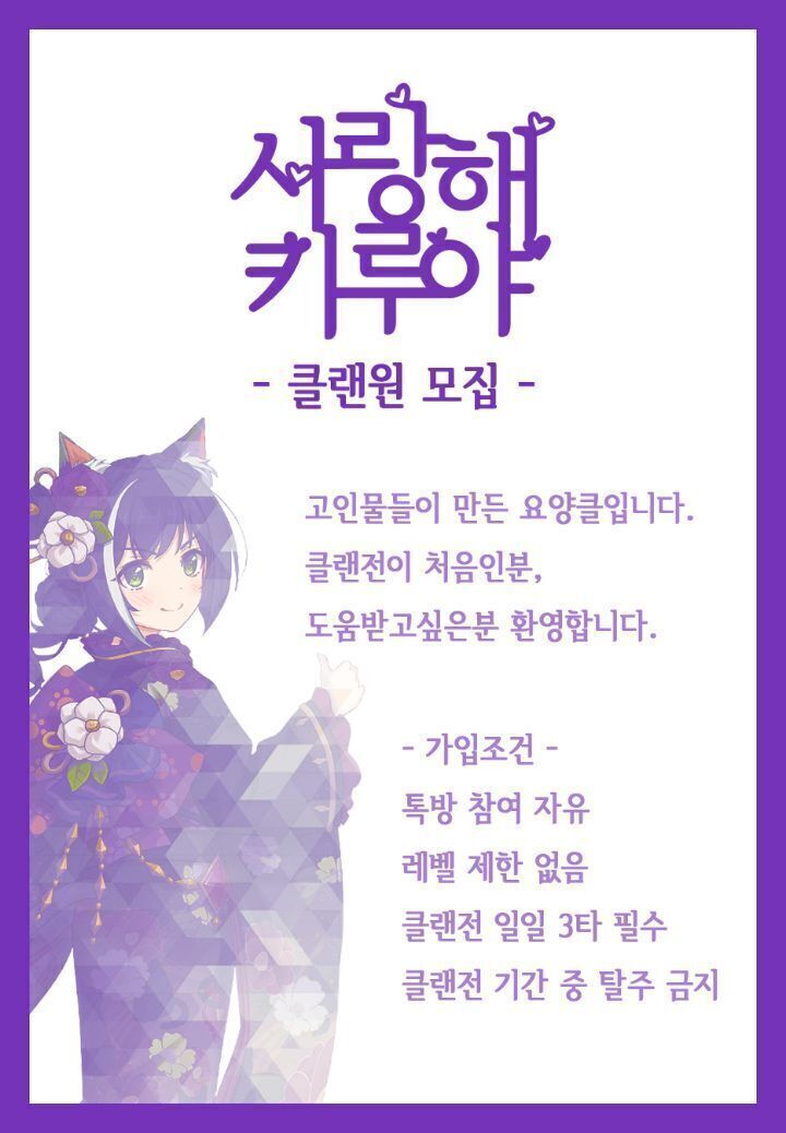 자유로운 요양클 사랑해키루야에서 클랜원 모집중입니다!! 일일 3타만치신다면 뭐든 올 OK 가끔 클장님이 방송도 해서 심심함을 달래주는 즐거운 요양클!!
