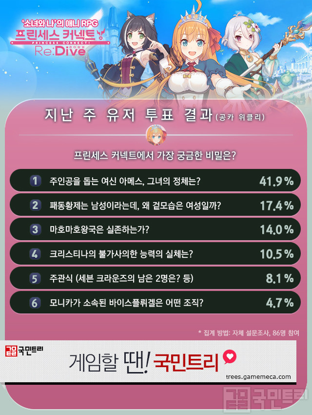 프린세스 앙케이트입니다. 프린세스 커넥트에서 가장 궁금한 비밀이 주제였는데요. 1위는 주인공을 돕는 소녀 아메스의 정체입니다. 콧코로가 섬기는 여신이며, 스토리에서 주인공을 돕는 조력자 역할이죠. 톡톡 튀는 발언으로 유저의 공감을 사거나, 세계의 비밀을 파헤치기 위해 애쓰는 장면이 많습니다. 어째서 적극적으로 활동할 수 없는지, 또 주인공을 돕는 이유는 무엇인지 궁금해하는 이가 많았네요.