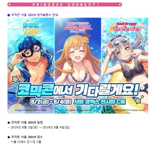 오프라인 행사를 즐기는 유저라면 이 소식을 놓치지 마세요. 프린세스 커넥트가 ‘코믹콘 서울 2019’에 참여합니다. 다양한 행사와 즐길거리, 유저를 위한 스페셜 이벤트를 준비했다고 하네요. 지난 20~21일에 개최한 ‘서울 코믹 월드’에 이은 두 번째 오프라인 행사인데요. 이번 행사는 8월 2일부터 4일까지, 코엑스 전시장 C홀에서 열리니 참고하시길 바랍니다.