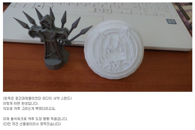 끝으로 유저가 만든 굿즈도 살펴보죠. 공식 카페의 유키리안(플로라)는 3D 프린터로 캬루 도장을 제작해 화제입니다. 본래 4월 카페 이벤트에 참여할 목적이었으나, 사정이 생겨 최근 다시 만들었다고 하네요. 그 외에도 자세한 제작 과정을 공개했으니 3D 프린터와 굿즈 제작에 관심있는 팬이라면 참고하세요.