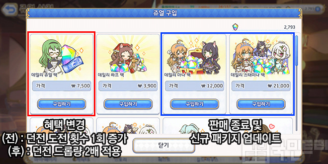 대규모 업데이트 후 유료 상품 데일리 쥬얼 팩의 혜택이 ‘던전 드롭량 2배 적용’으로 바뀝니다. 패키지를 이용 중이던 계정은 던전 이용 횟수가 2/2에서 1/1로 변경되니 참고하세요. 데일리 마나 팩과 데일리 스태미나 팩은 판매 종료하며, 신규 패키지 2종으로 품목이 교체됩니다. 업데이트 전 상품을 구매한 경우 매일 혜택은 종료일까지 수령 가능하니 알아두세요.
