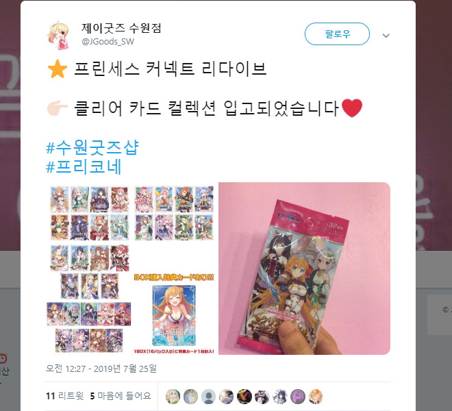 카드 콜렉터라면 제이굿즈 수원의 입고 소식을 주목하세요. 제이굿즈는 다양한 서브컬쳐 굿즈를 판매하는 매장인데요. 지난 25일 프린세스 커넥트 굿즈를 입고했습니다. 팩을 뜯어 캐릭터 카드를 수집하는 상품이죠. 미식전과 트윙클 위시 등 매력적인 캐릭터가 그려진 카드를 수집해보세요.