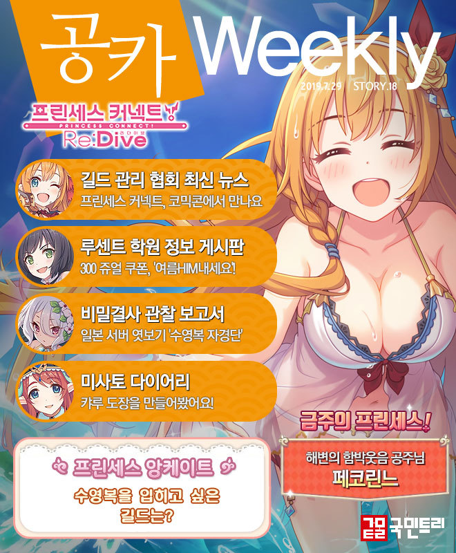 안녕하세요. 당신과 이어지는 애니메이션 RPG ‘프린세스 커넥트 리다이브(이하 프린세스 커넥트)’의 열 여덟 번째 공카 위클리 시간입니다. 마침내 유저들이 고대하던 여름 업데이트가 임박했습니다. 오는 30일 진행될 예정이며, 수영복 차림의 페코린느와 콧코로가 먼저 우리 곁을 찾아오죠. 공식 카페는 관련 이야기로 가득한데요. 그 모습을 공카 위클리와 함께 살펴보시길 바랍니다.