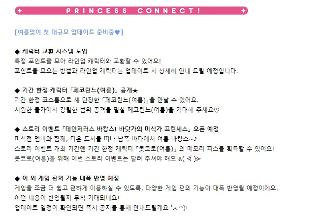 이번 주 첫 이슈는 여름맞이 대규모 업데이트입니다. 스토리 이벤트 ‘데인저러스 바캉스! 바닷가의 미식가 프린세스’와 기간 한정 캐릭터 ‘페코린느(여름)’이 등장하죠. 그 뿐만이 아닙니다. 다양한 편의성 개선 업데이트도 함께 진행합니다. 캐릭터 교환 시스템이 대표적인데요. 일본 서버에서는 오픈 후 1년 만에 도입된 시스템입니다. 빠른 편의성 개선에 유저들은 크게 환호하는 분위기네요.